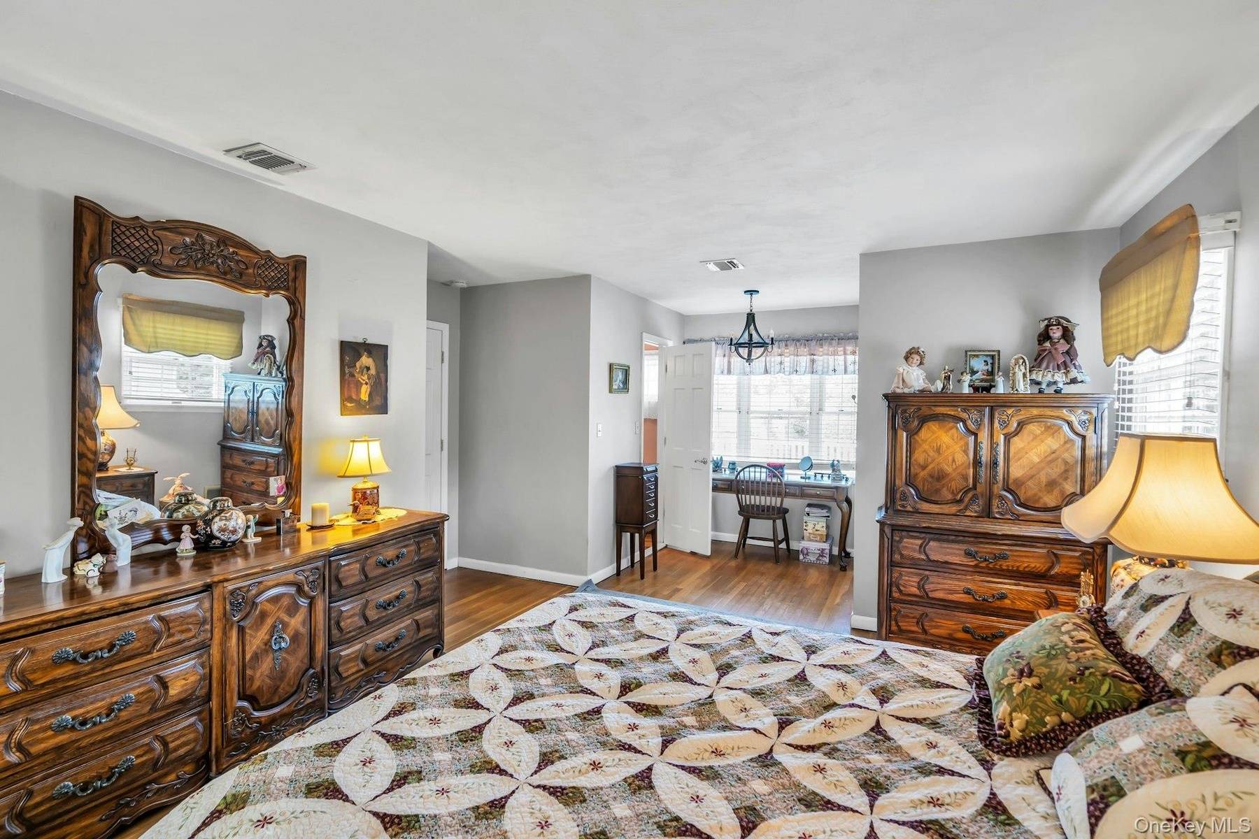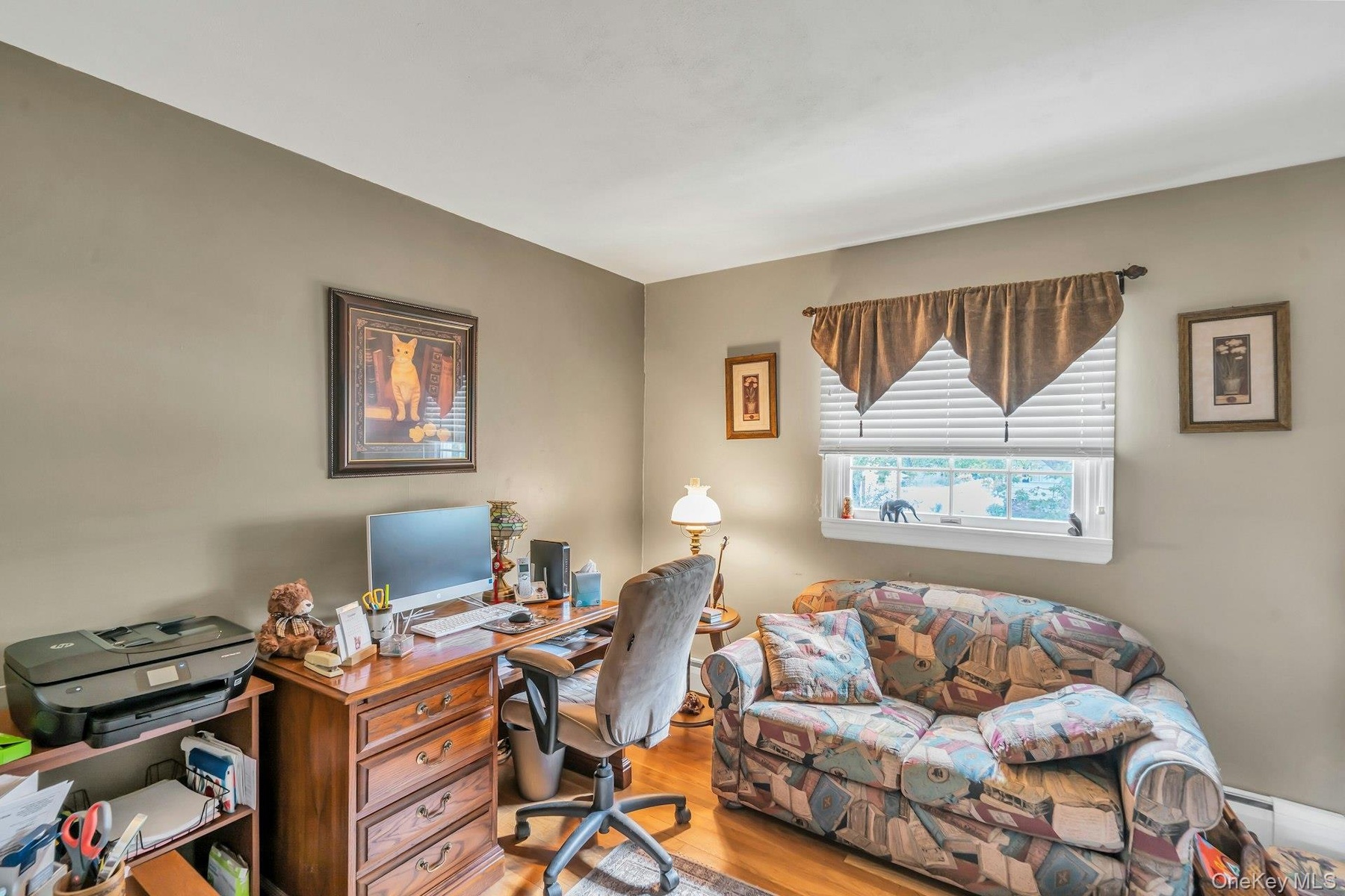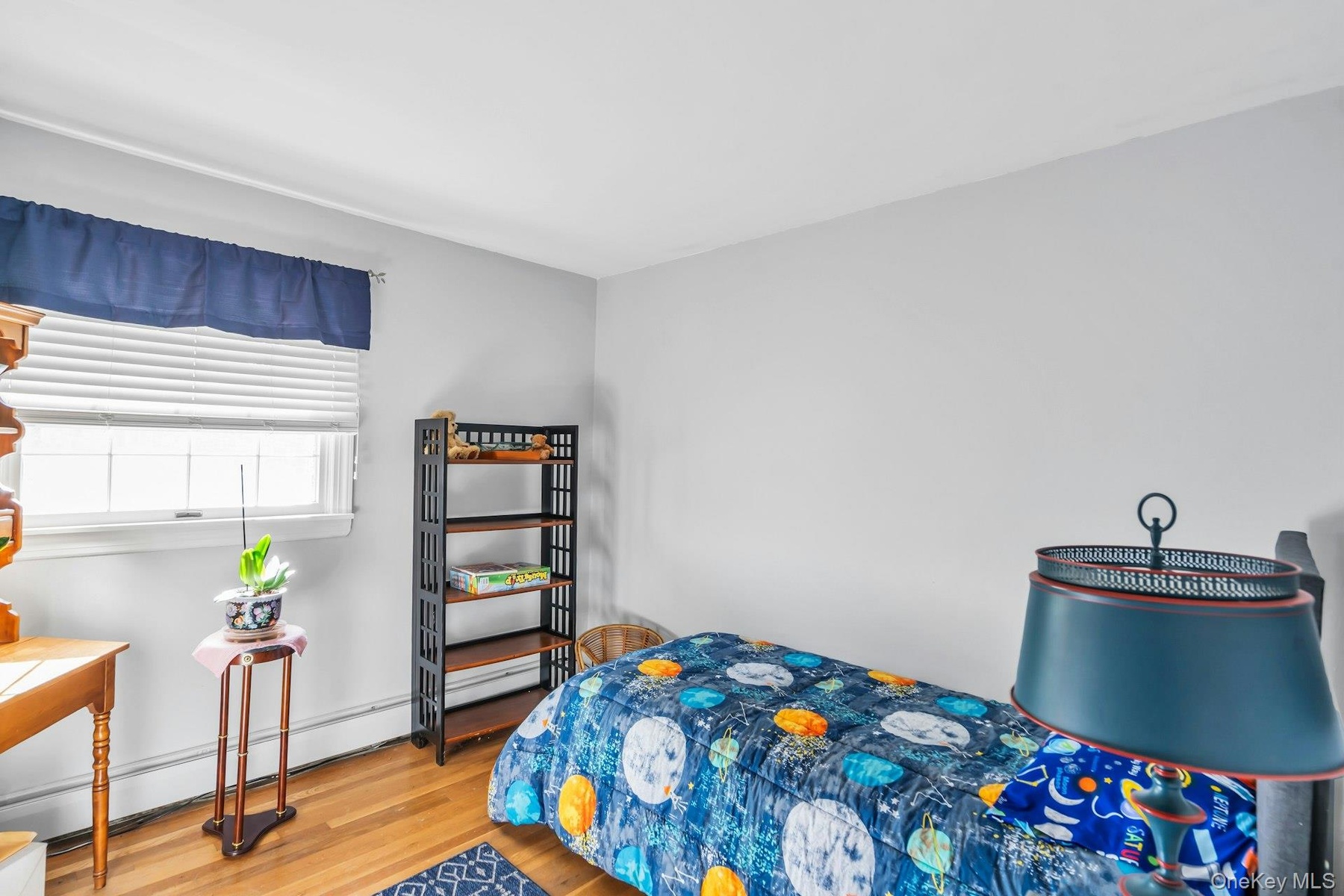 - Bedroom featuring wood finished floors and a baseboard heating unit