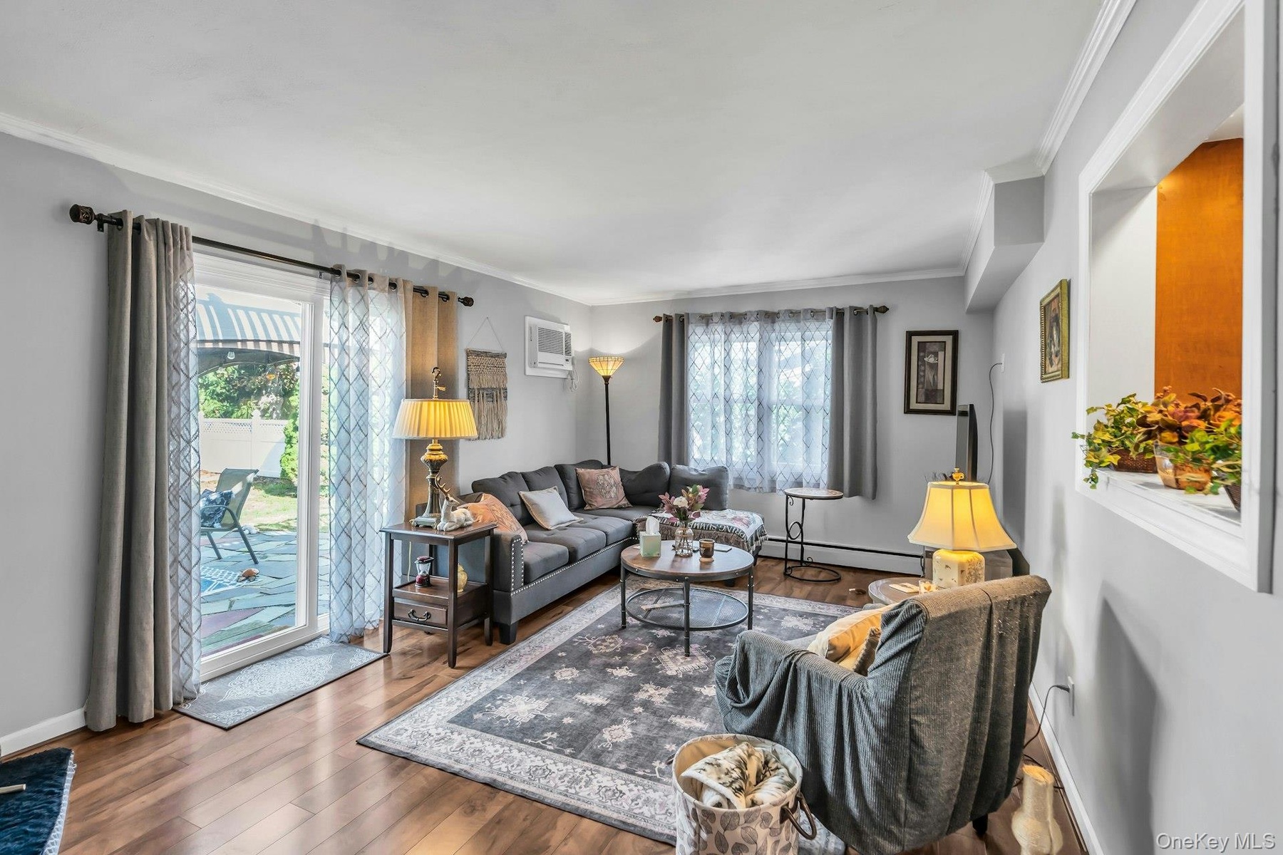 - Living room with ornamental molding, wood finished floors, a baseboard radiator, and a wall unit AC