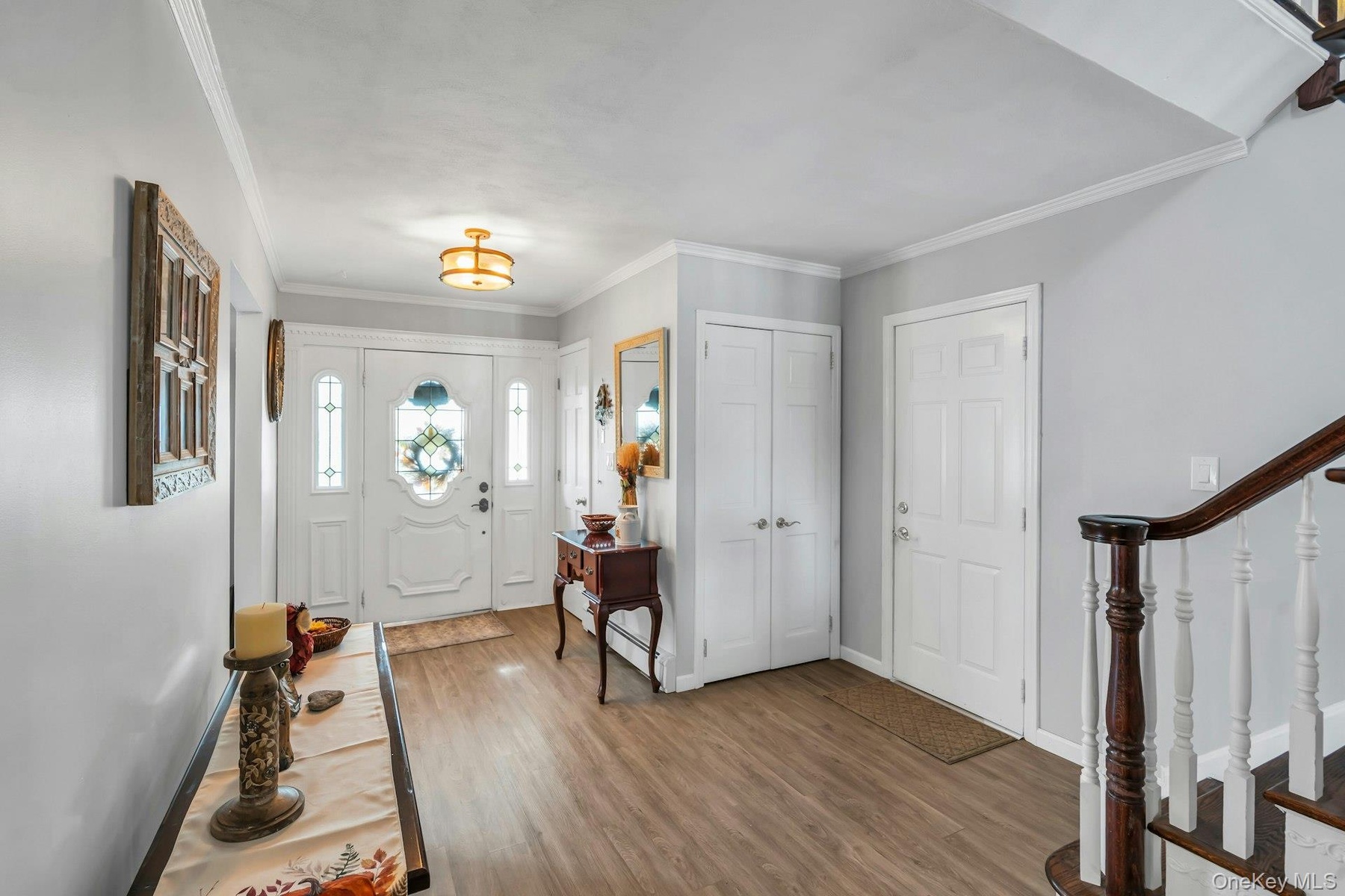 - Foyer entrance featuring stairs, crown molding, and wood finished floors
