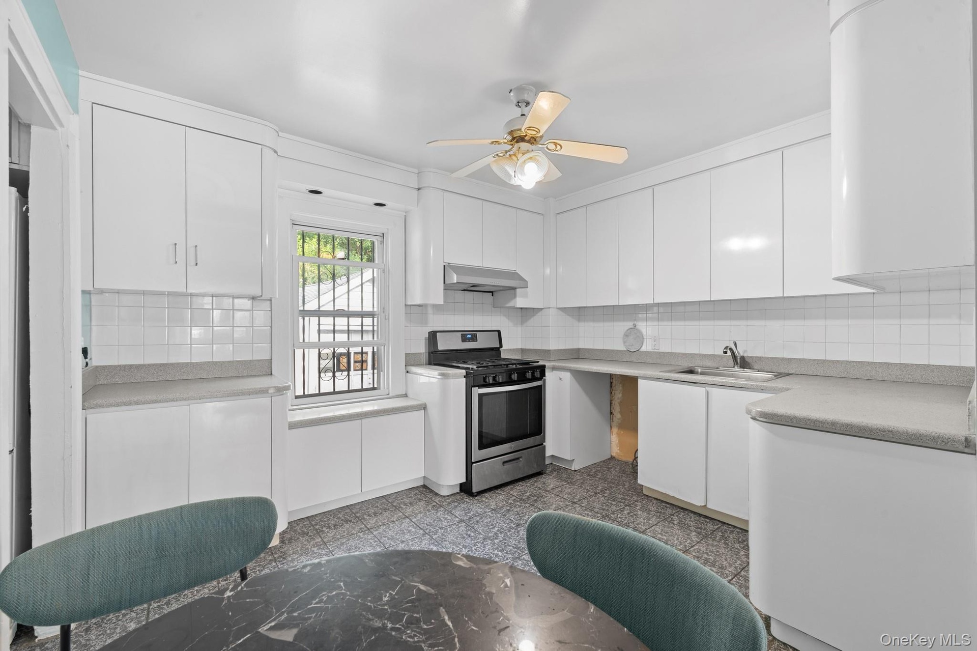 - Kitchen featuring tasteful backsplash, stainless steel gas stove, white cabinetry, and light countertops
