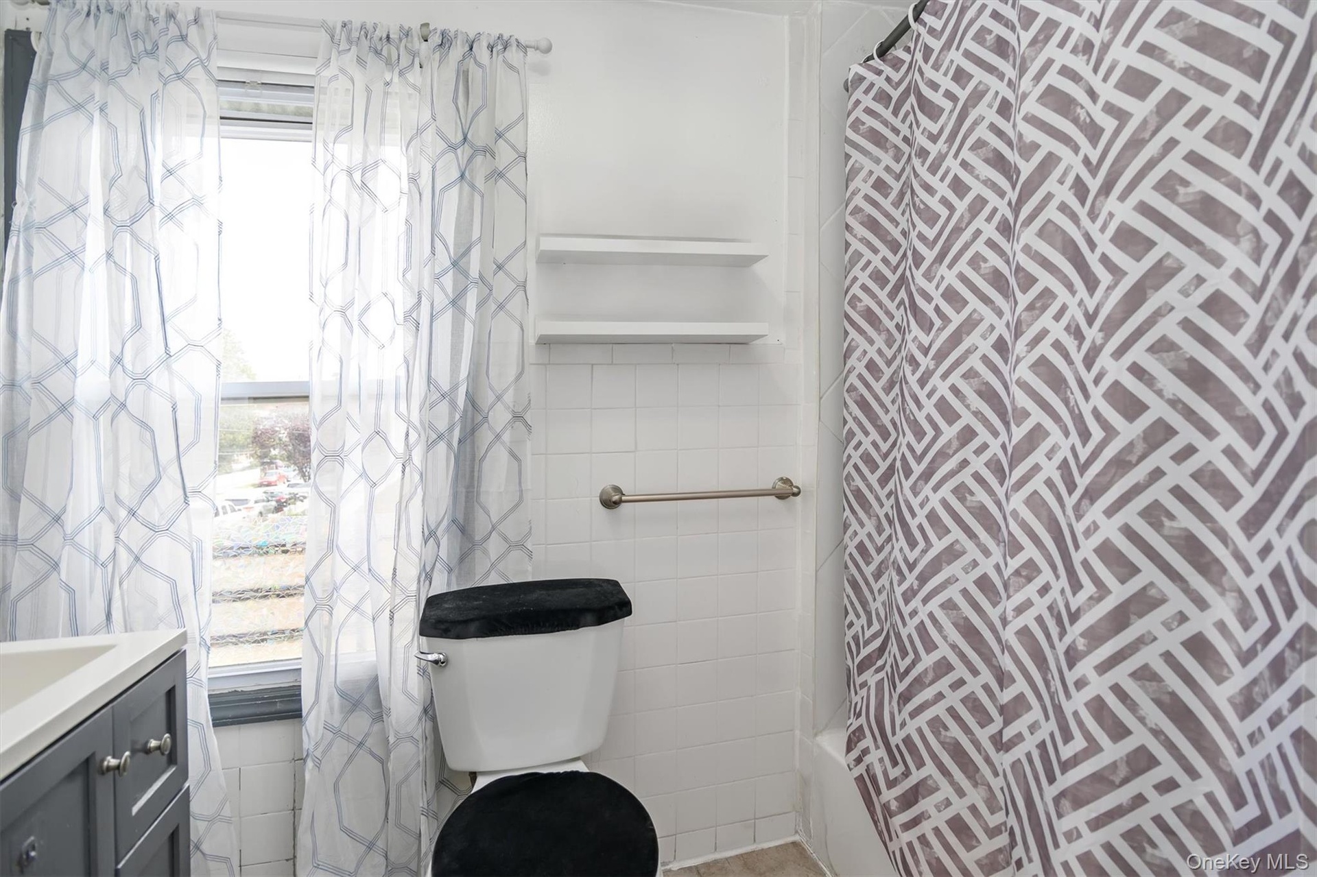 - Full bath featuring tile walls, vanity, and shower / bath combo with shower curtain