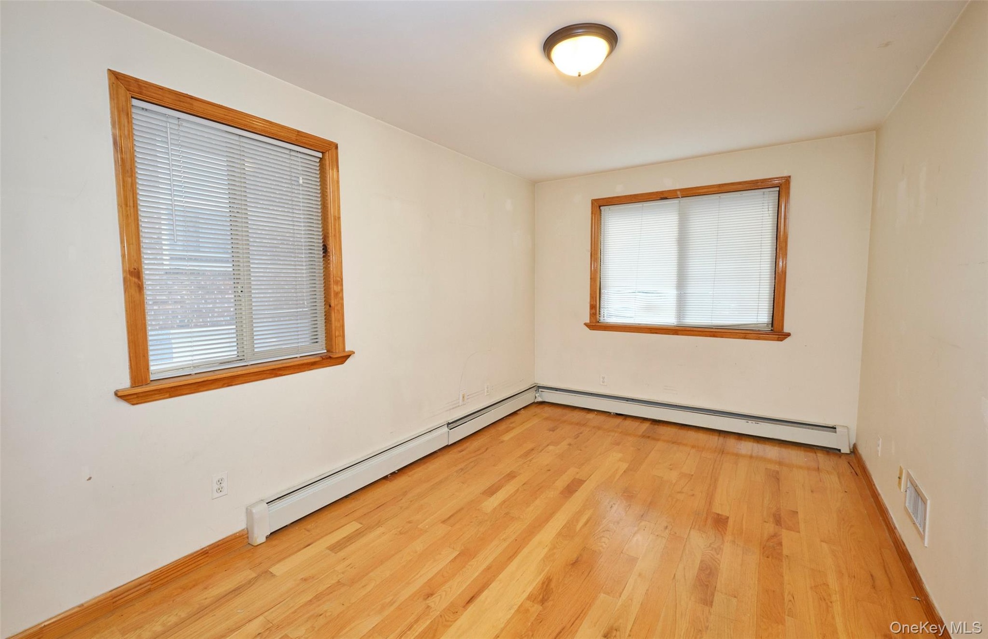 - Unfurnished room featuring light wood-style flooring and baseboard heating