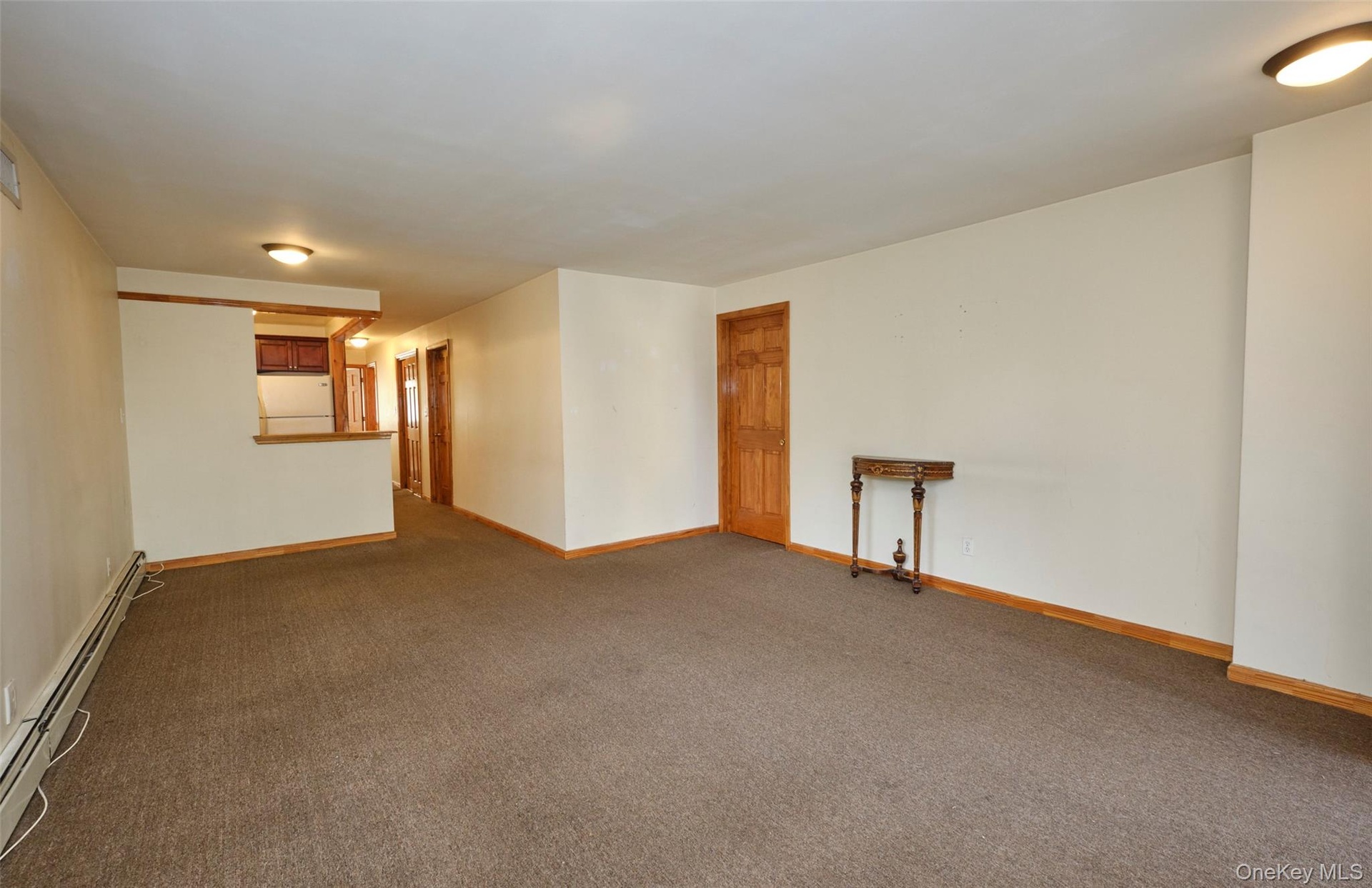 - Unfurnished living room with a baseboard radiator and light colored carpet