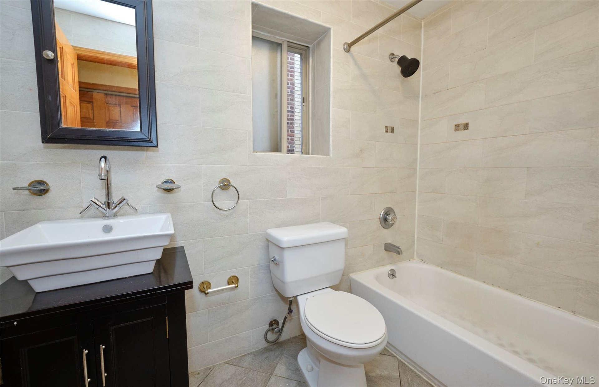 - Full bath featuring bathing tub / shower combination, tile walls, vanity, and tile patterned flooring