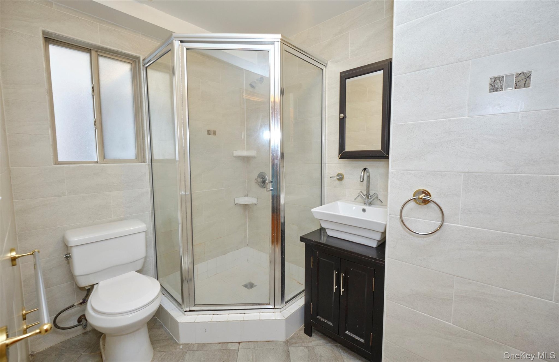 - Full bathroom featuring vanity, a shower stall, and tile walls