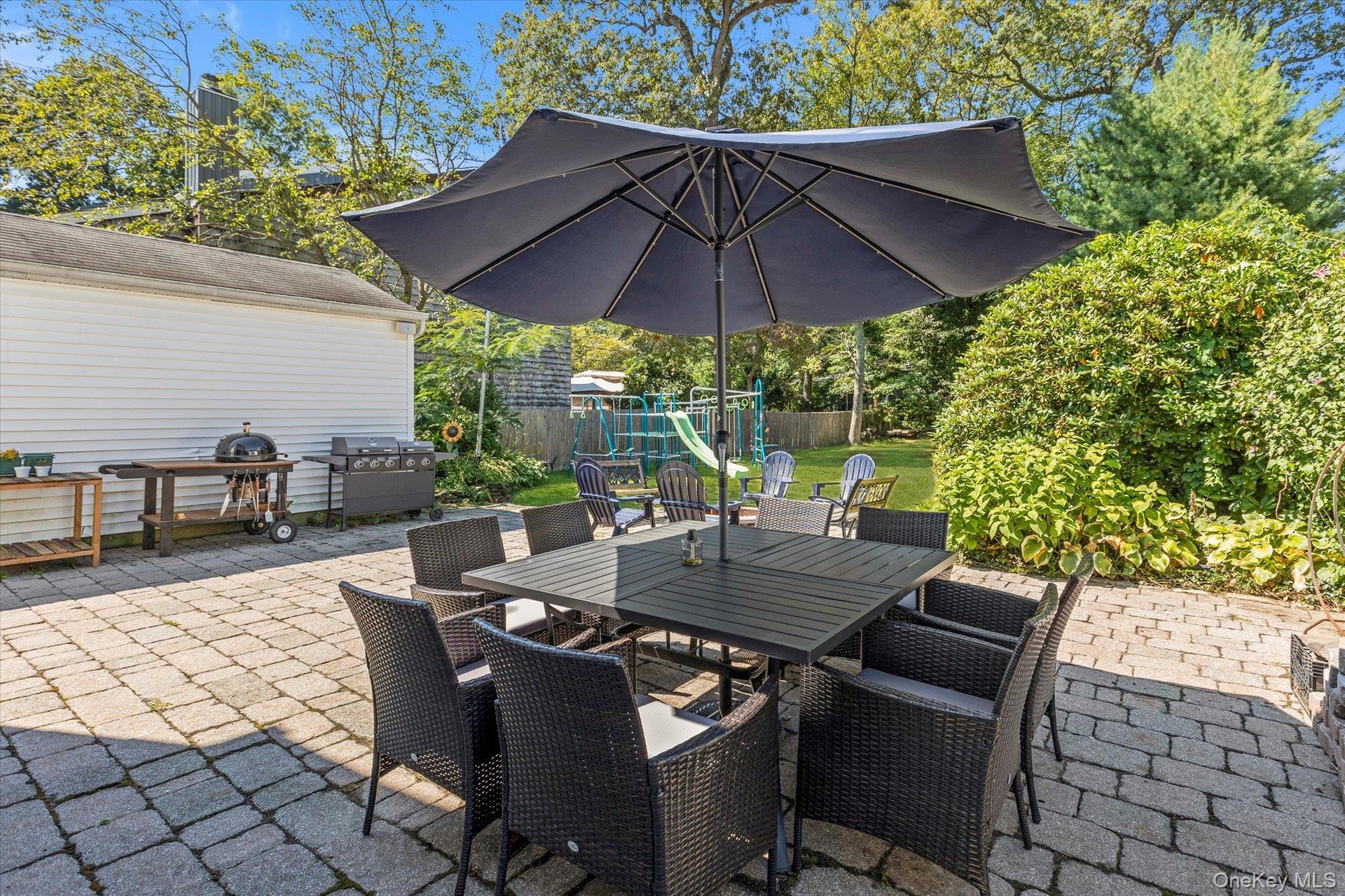 - Fenced backyard with a playground, a patio, outdoor dining area, and a grill