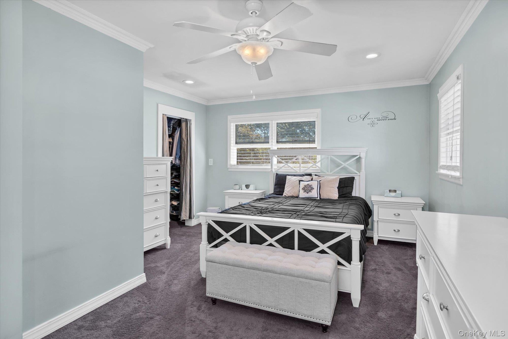 - Bedroom featuring a walk in closet, crown molding, multiple windows, dark carpet, and recessed lighting