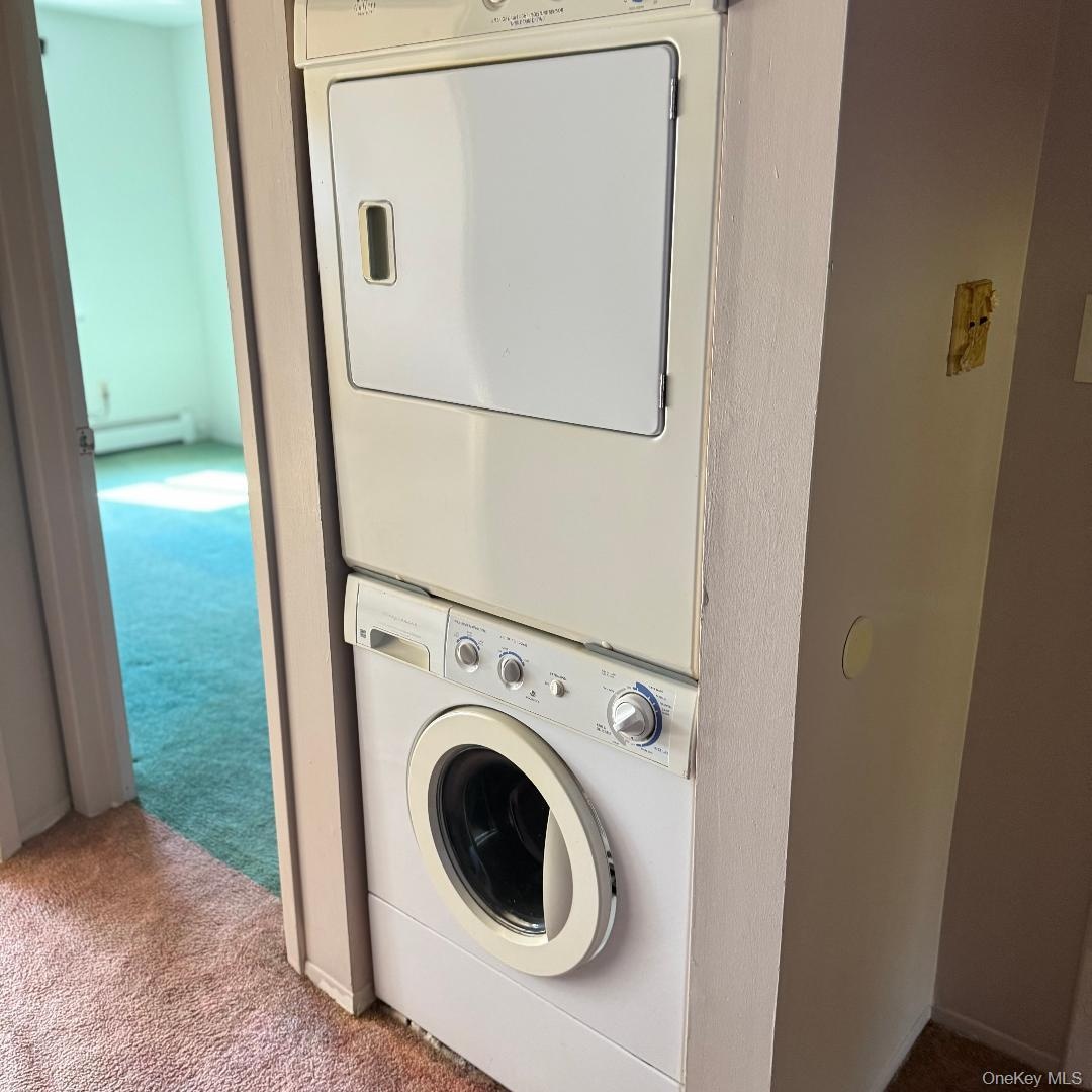 - Washroom featuring carpet flooring, stacked washer and clothes dryer, and a baseboard radiator