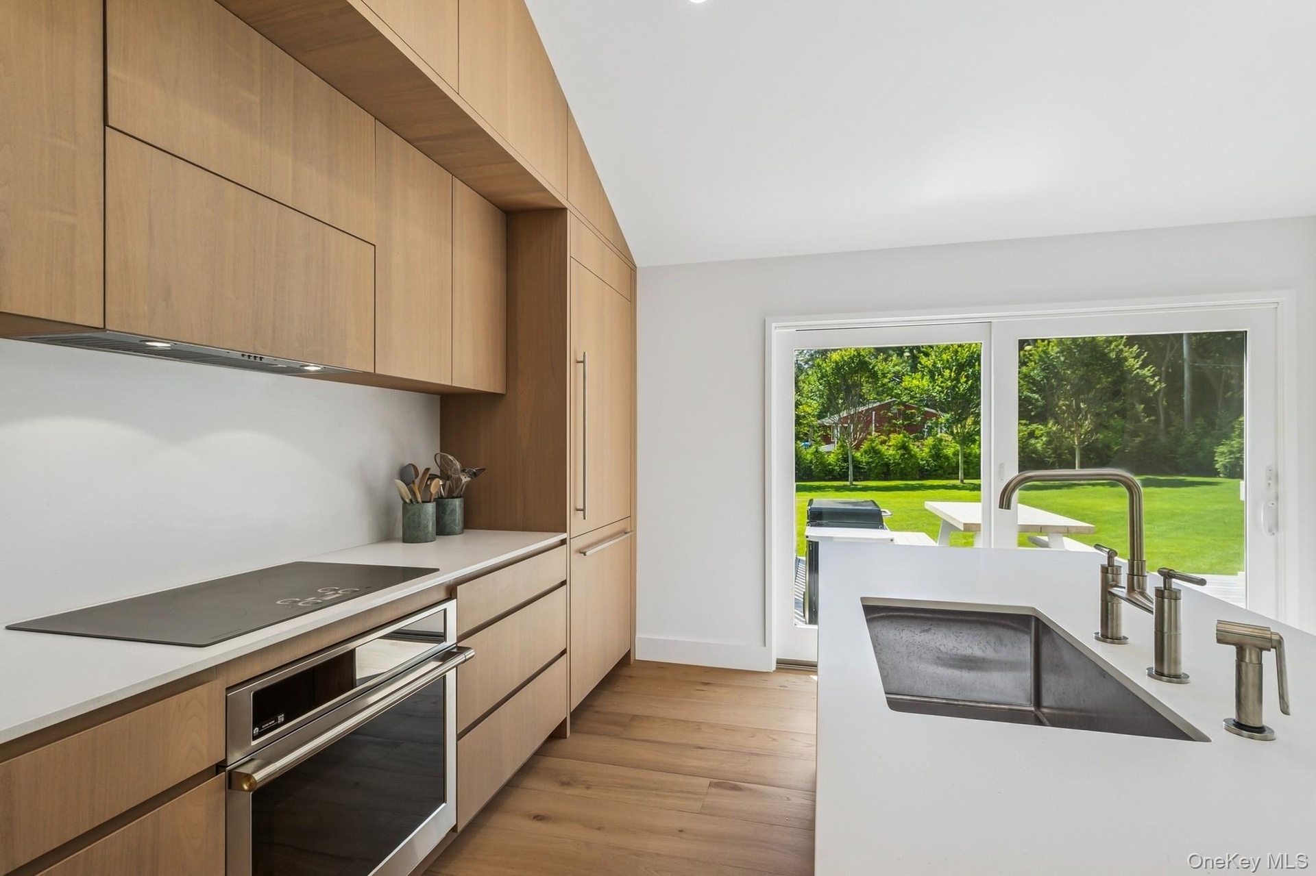- Kitchen featuring modern cabinets, oven, light wood finished floors, black electric cooktop, and light stone counters