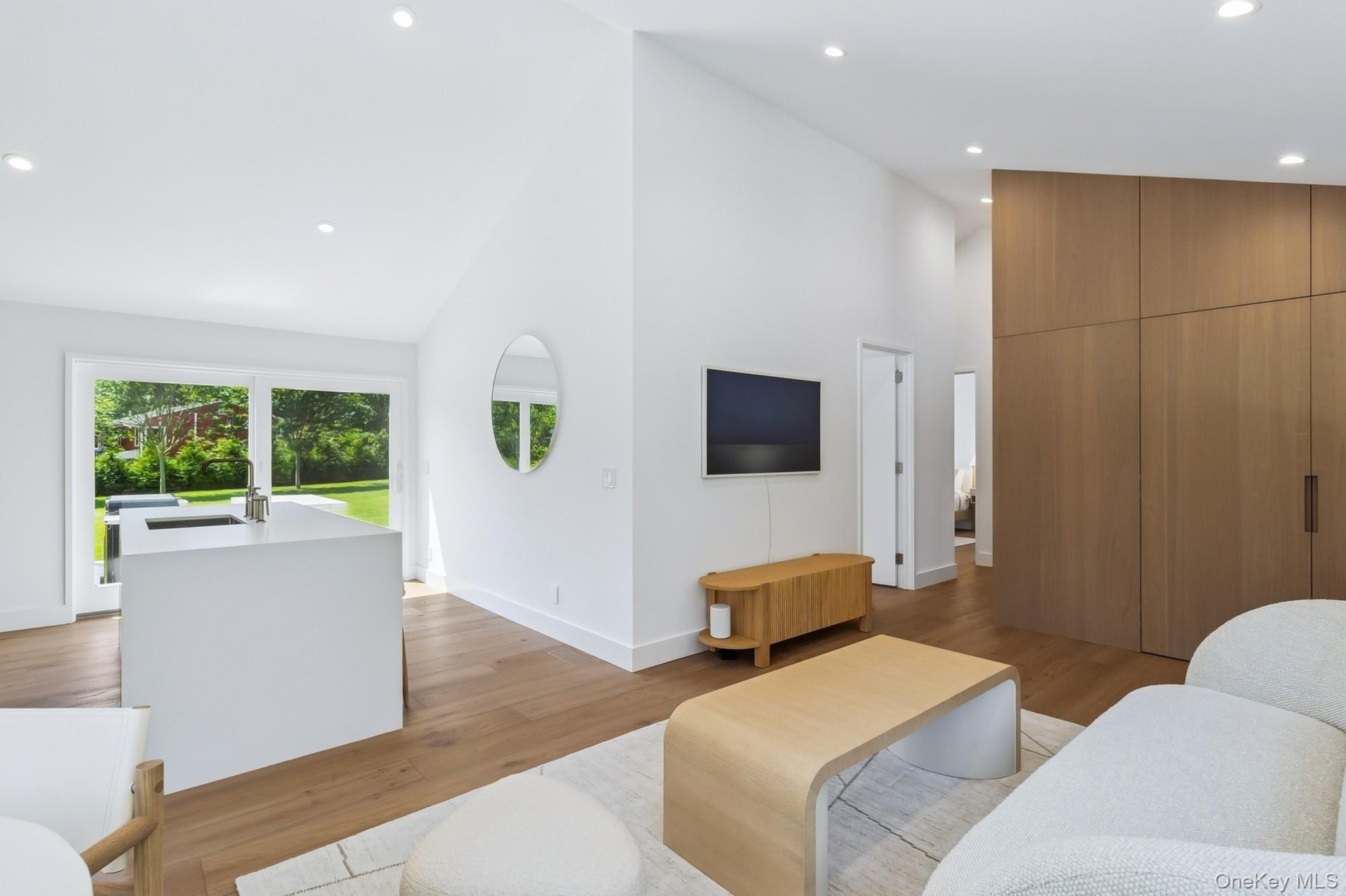 - Living area with high vaulted ceiling, light wood-style floors, and recessed lighting