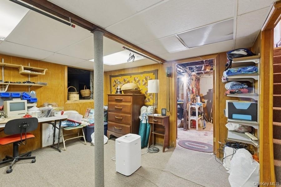 - Finished below grade area featuring wooden walls, light colored carpet, a paneled ceiling, and a desk