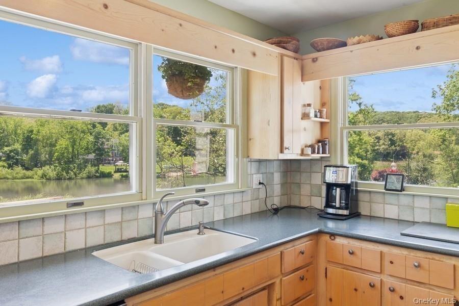 - Kitchen featuring dark countertops, tasteful backsplash, light brown cabinets, and open shelves
