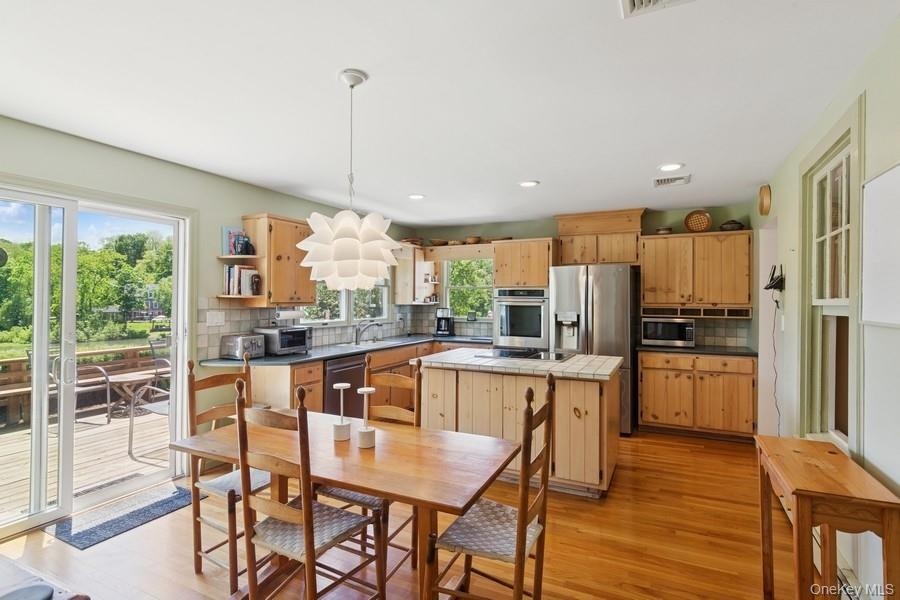 - Kitchen with appliances with stainless steel finishes, tasteful backsplash, tile countertops, light wood-type flooring, and recessed lighting