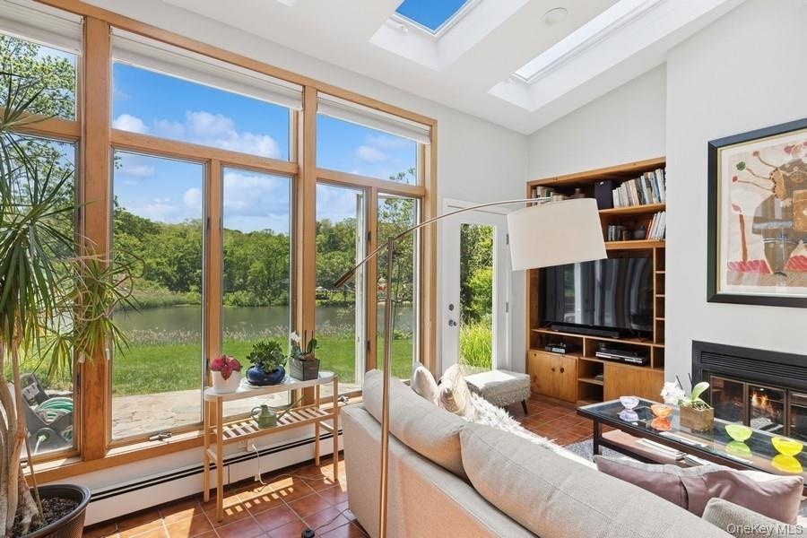 - Living area with a baseboard heating unit, tile patterned floors, a glass covered fireplace, a skylight, and vaulted ceiling