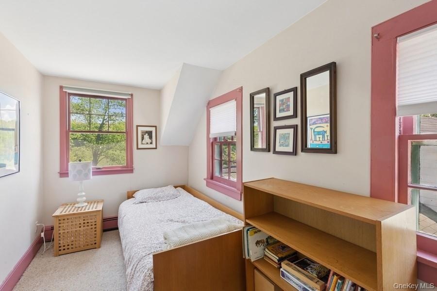 - Bedroom with carpet flooring, multiple windows, a baseboard heating unit, and vaulted ceiling