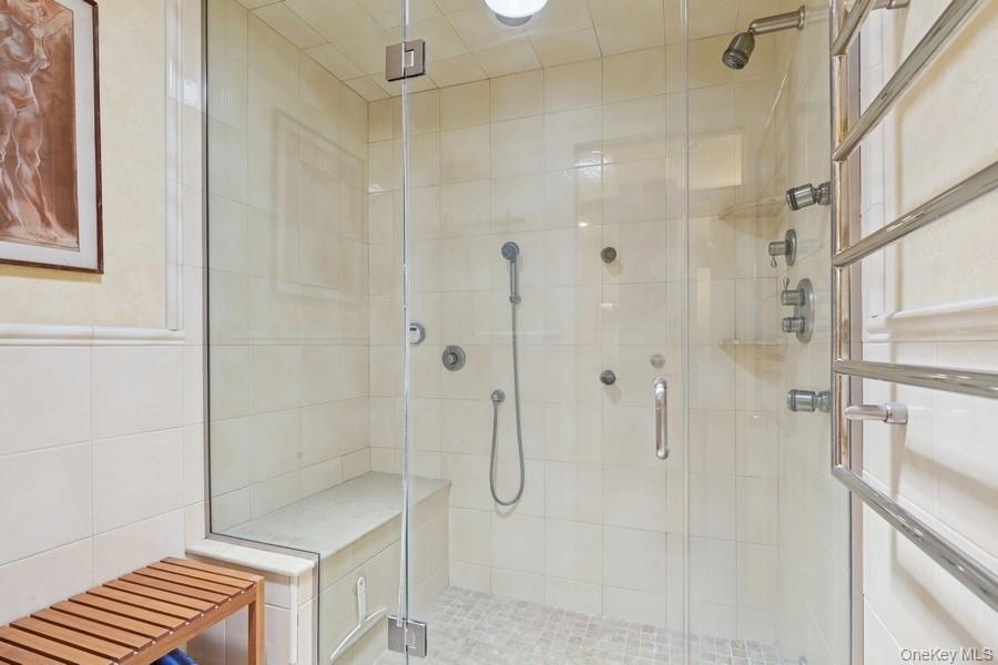- Full bathroom featuring double vanity, light tile patterned floors, and a stall shower