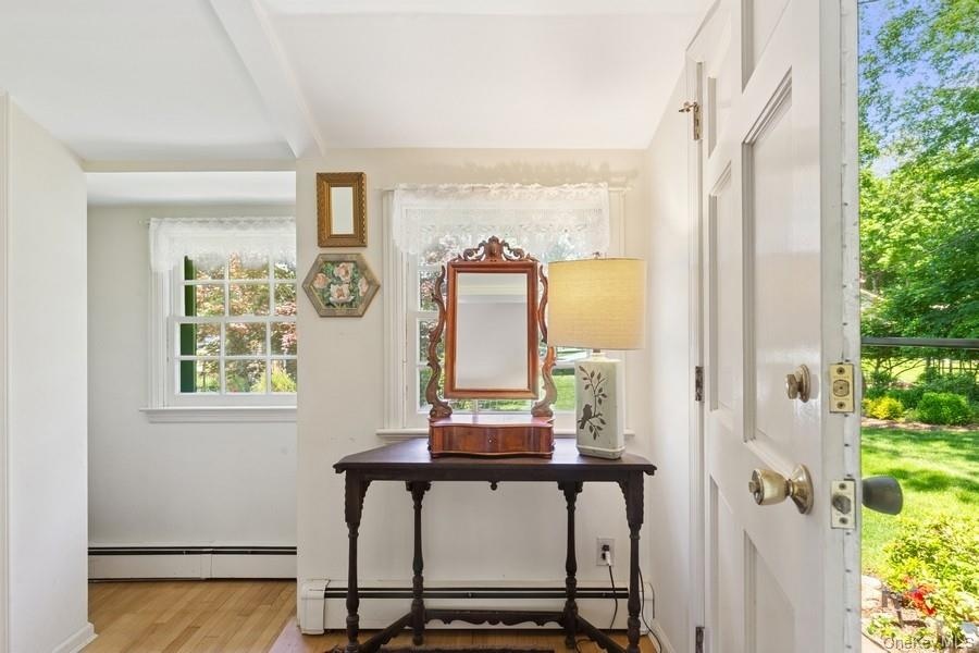- Doorway to outside with wood finished floors, baseboard heating, and beam ceiling