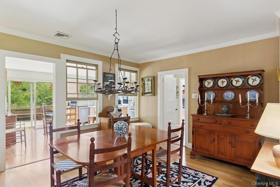 - Dining area featuring light wood finished floors, crown molding, and a chandelier