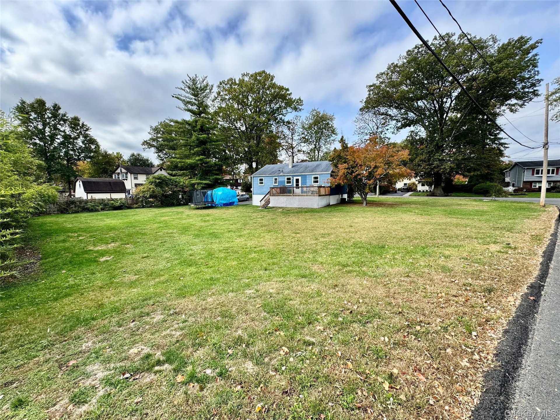 - View of green lawn featuring a wooden deck