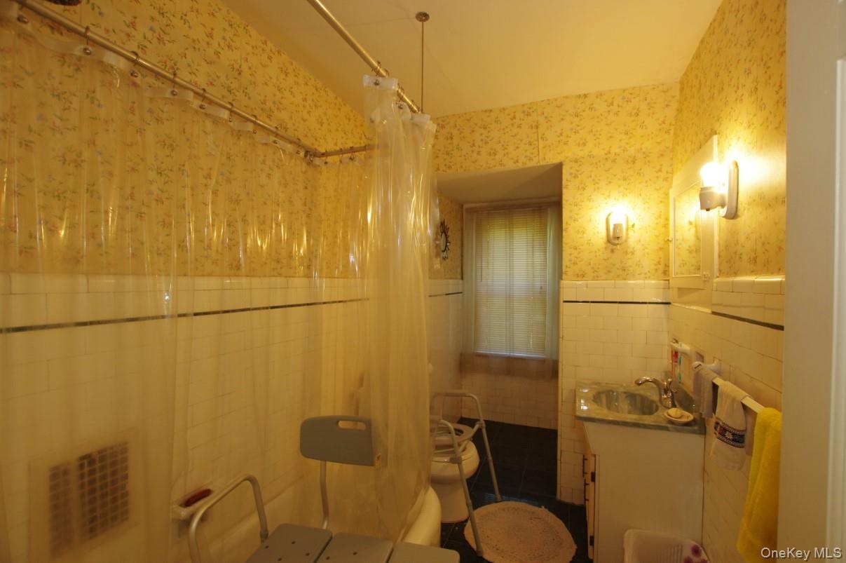- Full Bathroom featuring wallpapered walls, vanity, tile walls, a wainscoted wall, and shower / bath combination with curtain
