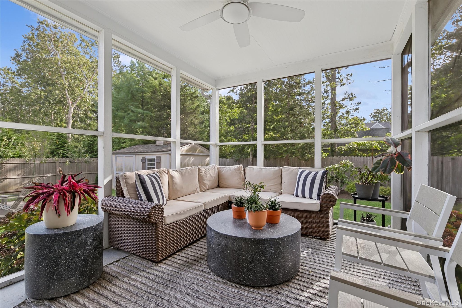 - Sunroom with healthy amount of natural light, a ceiling fan, and outdoor lounge area