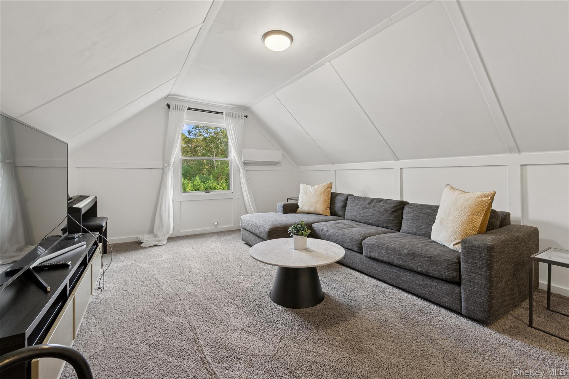 - Living area featuring lofted ceiling, carpet flooring, and a wall mounted air conditioner