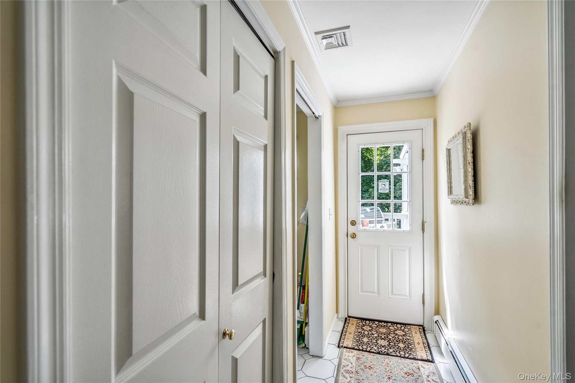 - Entryway with a baseboard radiator, crown molding, and tile patterned flooring