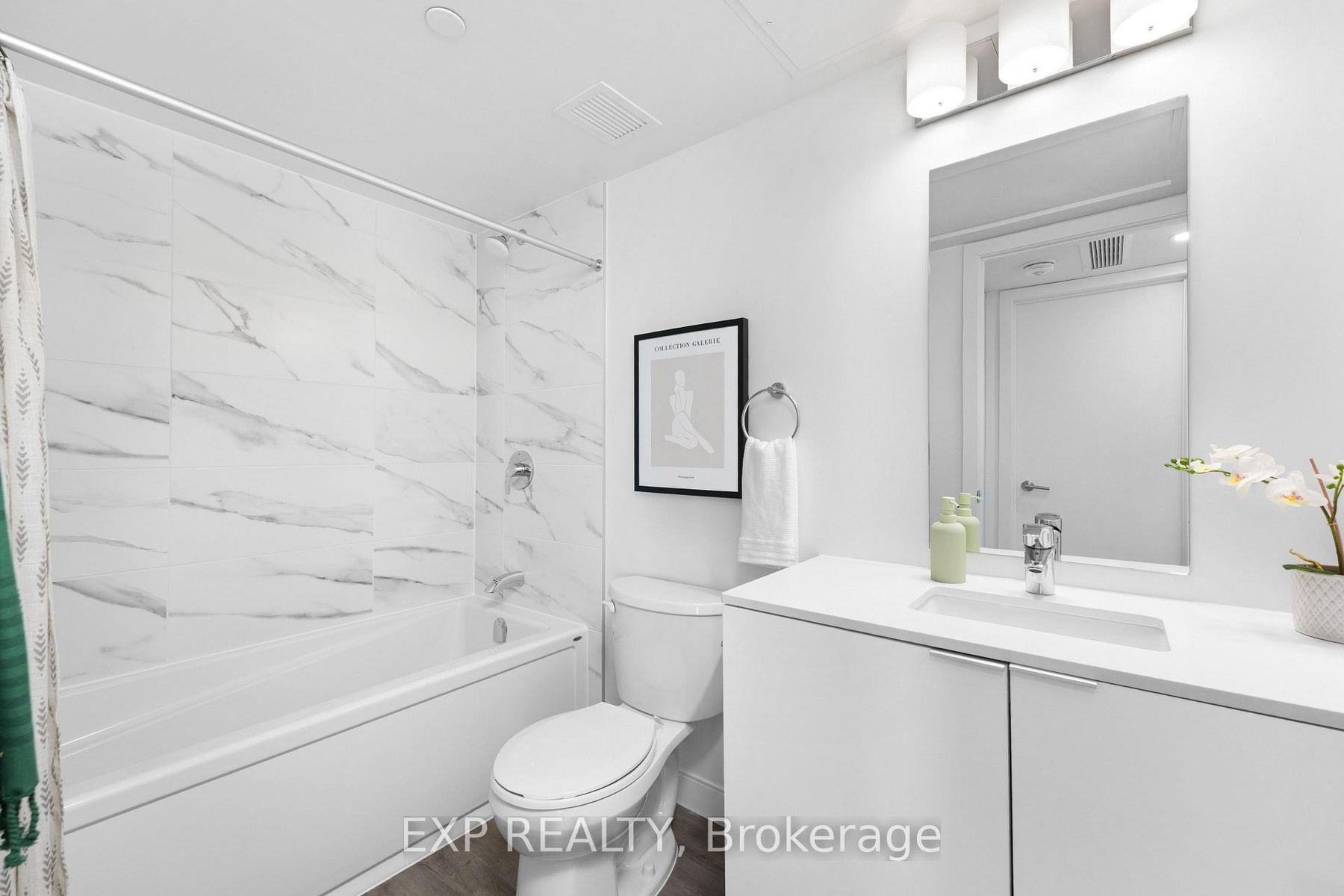 The Rose at The Manett is a thoughtfully designed 1-bedroom plus den suite with 749 square feet of interior living space and a 116 square foot balcony. Located on the 4th floor, this home offers south-facing views into greenery and Koretz Park, with plenty of morning light from its sunrise exposure. Inside, the open-concept layout creates a bright and welcoming atmosphere, featuring oversized windows, durable vinyl plank flooring, and a modern kitchen with quartz countertops, sleek cabinetry, and stainless steel appliances including a fridge, range, and dishwasher. The spacious bedroom includes a full-size closet and plenty of room to unwind, while the versatile den is ideal for a home office or guest space. A stylish 4-piece bathroom, in-suite laundry, and individually controlled heating and cooling ensure comfort year-round. Life at The Manett means more than just a beautiful suite. Residents enjoy access to premium amenities including a modern fitness centre, multipurpose social lounge with kitchen, landscaped courtyard, bicycle storage, underground parking, and attentive on-site property management. With secure key fob access, video surveillance, and visitor parking, convenience and peace of mind come built in. Located steps from Koretz Park and only minutes from grocery stores, schools, restaurants, and Mount Pleasant GO Station, The Rose offers the perfect blend of location, livability, and modern design with views that make every day feel connected to nature.