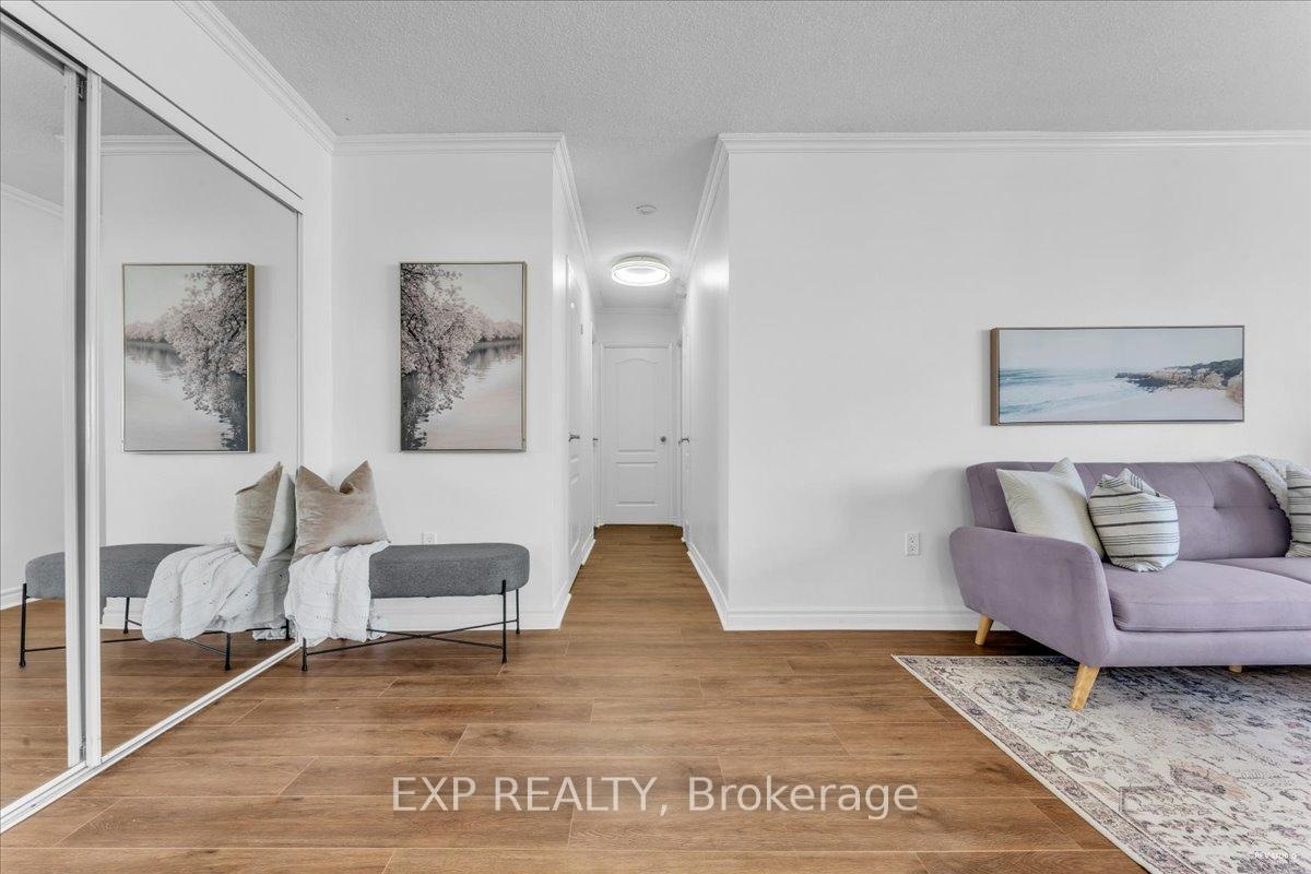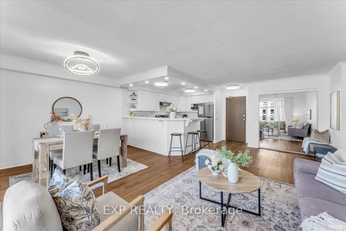 Beautifully renovated corner unit. This 2 bedrooms, 2 bathrooms model suite offers a bright and functional layout with updated laminate flooring, crown molding, pot lights, and floor-to-ceiling windows. The open concept kitchen boasts stainless steel appliances, quartz backsplash, and plenty of quartz counter space. Spacious living/dining area with walk-out to an oversized north-facing balcony. Two large bedrooms with big windows, including a primary with ensuite bath. Both bathrooms have been tastefully updated. Conveniently located close to public transit, groceries, and all amenities. Dont miss outbook your private showing today!