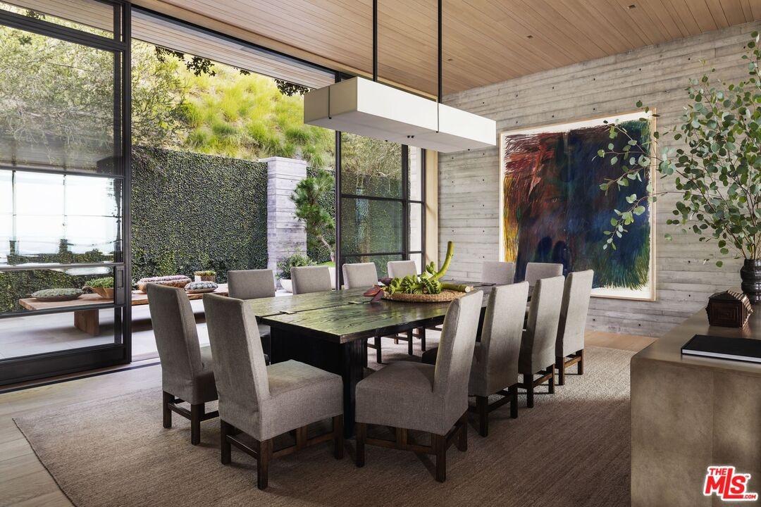 DescriptionThe Hollywood Hills House designed by Scott Mitchell Studio is a monumental and versatile modern villa rising out of the Hollywood Hills. The layered and terraced house - designed for living and entertaining - embraces views that span L.A.'s cityscape from east to west and out to the Pacific Ocean. This property is set on Los Angeles's most iconic promontory that extends over one acre with no neighbors on either side and 270 views of the entire city. Set at the 50-yard line of legendary hot spots Chateau Marmont, Tower Bar, and the Hollywood Bowl, the energy of the city can be seen and felt from the estate's peaceful privacy. Additionally, the property borders state land so no building can be constructed behind it, and it has private access to hiking in the famous Runyon Canyon. The form of the house follows a rigorous commitment to rich, organic materials and light. Grand outdoor decks provide seamless indoor and outdoor living. With expansive volumes over three floors, the tranquil and rooted hillside haven exudes a sense of balance, repose and a seamless connection to the natural landscape. A secluded driveway inclines to an impressive, cobbled motor court that can accommodate 12 or more cars and is nestled under the house with far-reaching views across the city. From there the villa's grand and wide staircase begins, following the form of the building, passing a large-scale, vertical water feature to the landscaped north terrace and walkway, where native plantings and open fires frame the principal steel window and door entry system. On entering, to the east is a luxurious study and to the west, an open living room with fireplace and views across the city that flows into the dining room and on to the kitchen and family room, where floor to ceiling glass sliding doors open seamlessly connecting indoor and outdoor and framing wide urban vistas. On the exterior, wire-brushed narrow Itauba deck boards and an elegant dark stone clad infinity pool and hot tub are flanked by a sunken fire pit and seating area. A stand-alone pool bar and lounge is connected by a covered breezeway adjacent to an outdoor seating area. Walkways and terraces continue around the house incorporating native oaks and under-storied plantings that are composed with elements of fire and water. On the upper level, the primary bedroom wing comprises not only the primary bedroom but separate bathrooms and dressing rooms, and a study that can be isolated from the rest of the suite by a discreet pocket door system. On the lower level is a recreational zone with state-of-the-art screening room, billiards room with lounge area, and a bar. These program elements are organized around a gracious distribution foyer which doubles as a secondary point of entry to the house and leads to the motor court, which can be converted into a conditioned, modern ballroom. The house was built over a 10-year period, and new codes have been created since its construction, preventing a home of this type ever being built again in the Hollywood Hills. The house is constructed with $30 million of solid poured-in-place board-formed concrete with three feet thick concrete walls, and over 100 caissons that go 100 feet deep. The hard cost of the construction is $3,500 a square foot not including the land. The project engaged JRC Group, Inc., arguably the best builder in the city. The house includes a multi-million-dollar Jada steel door package, custom millwork, and audio/visual.Amenities- Breakfast Area