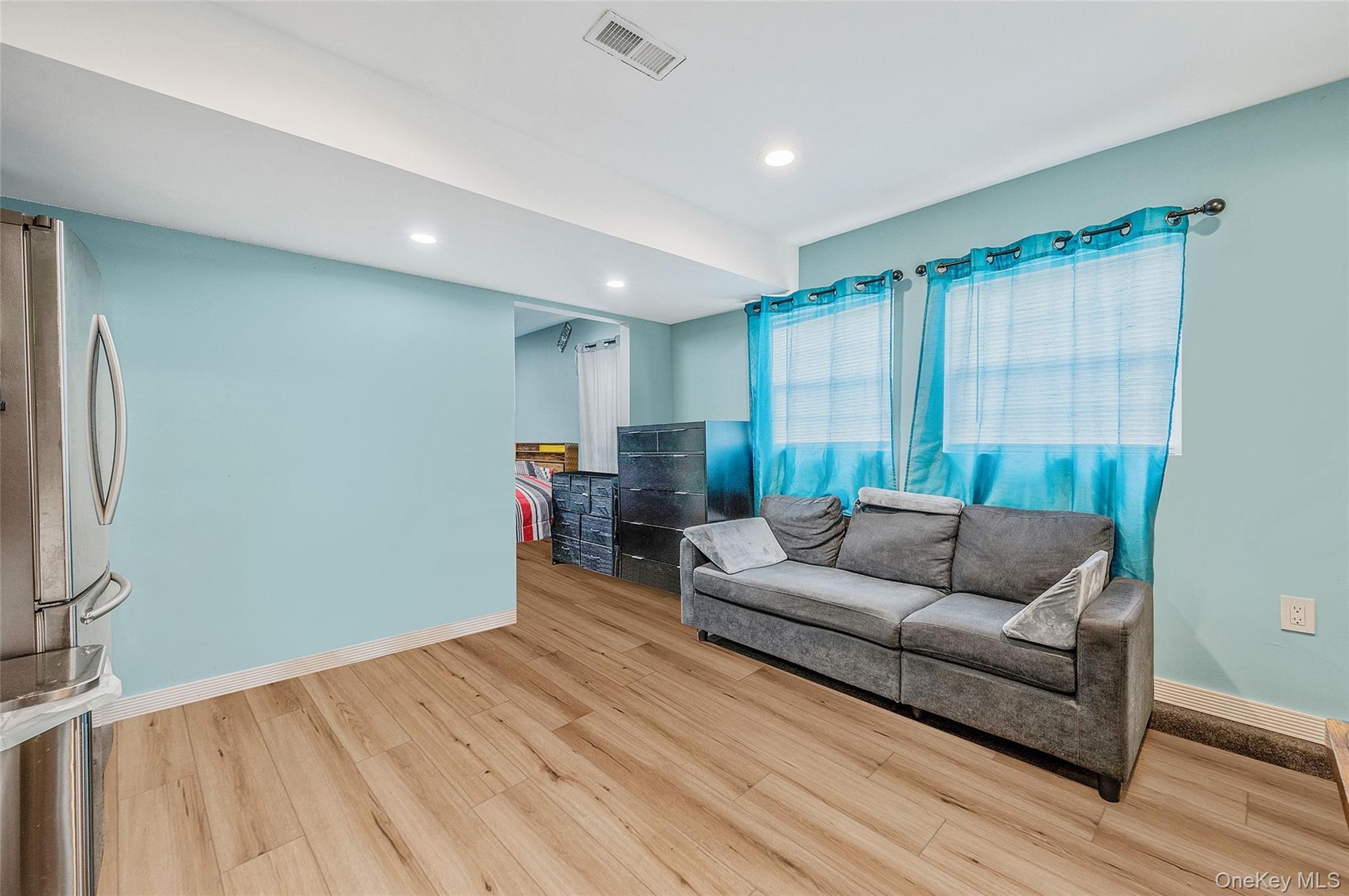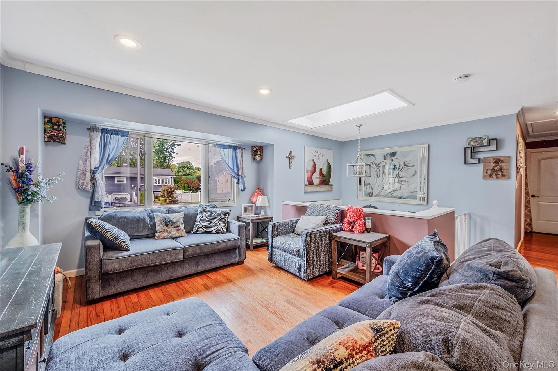 - Living room with ornamental molding, hardwood / wood-style flooring, recessed lighting, and a skylight