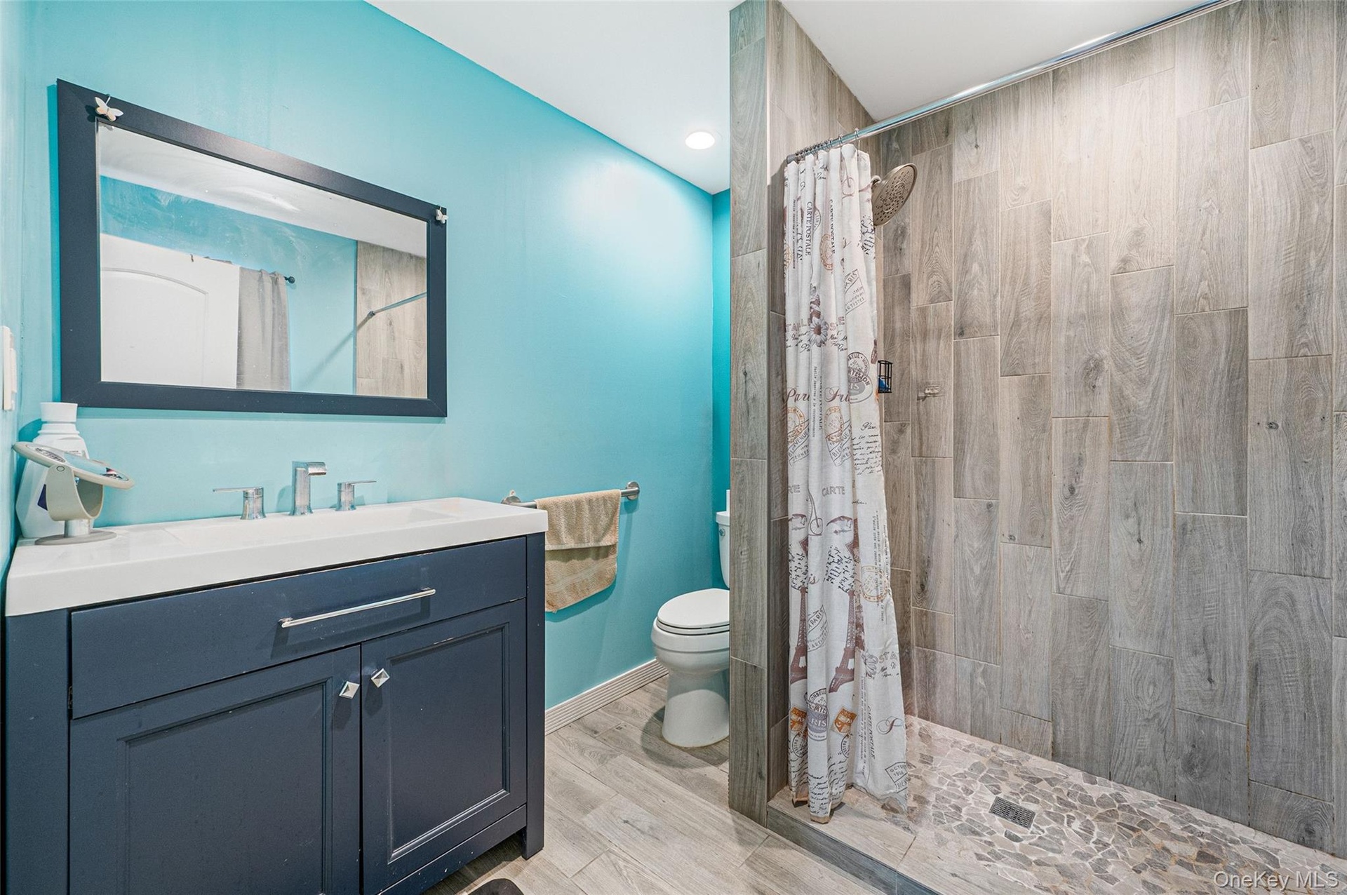 - Bathroom featuring a stall shower, vanity, light wood-style floors, and recessed lighting