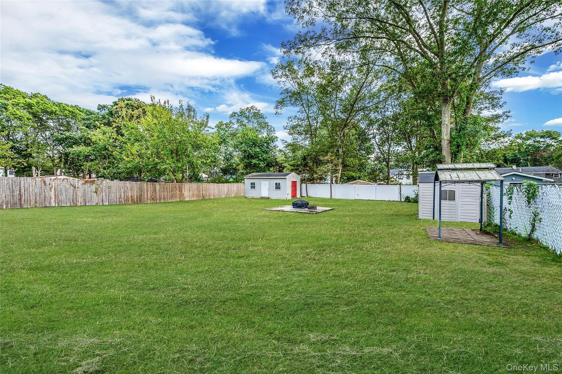 - Fenced backyard featuring a patio area, view of wooded area, a storage unit, and an outdoor fire pit