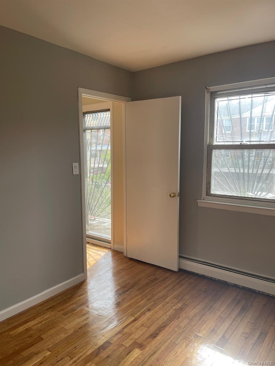 - Empty room with hardwood / wood-style flooring and a baseboard heating unit