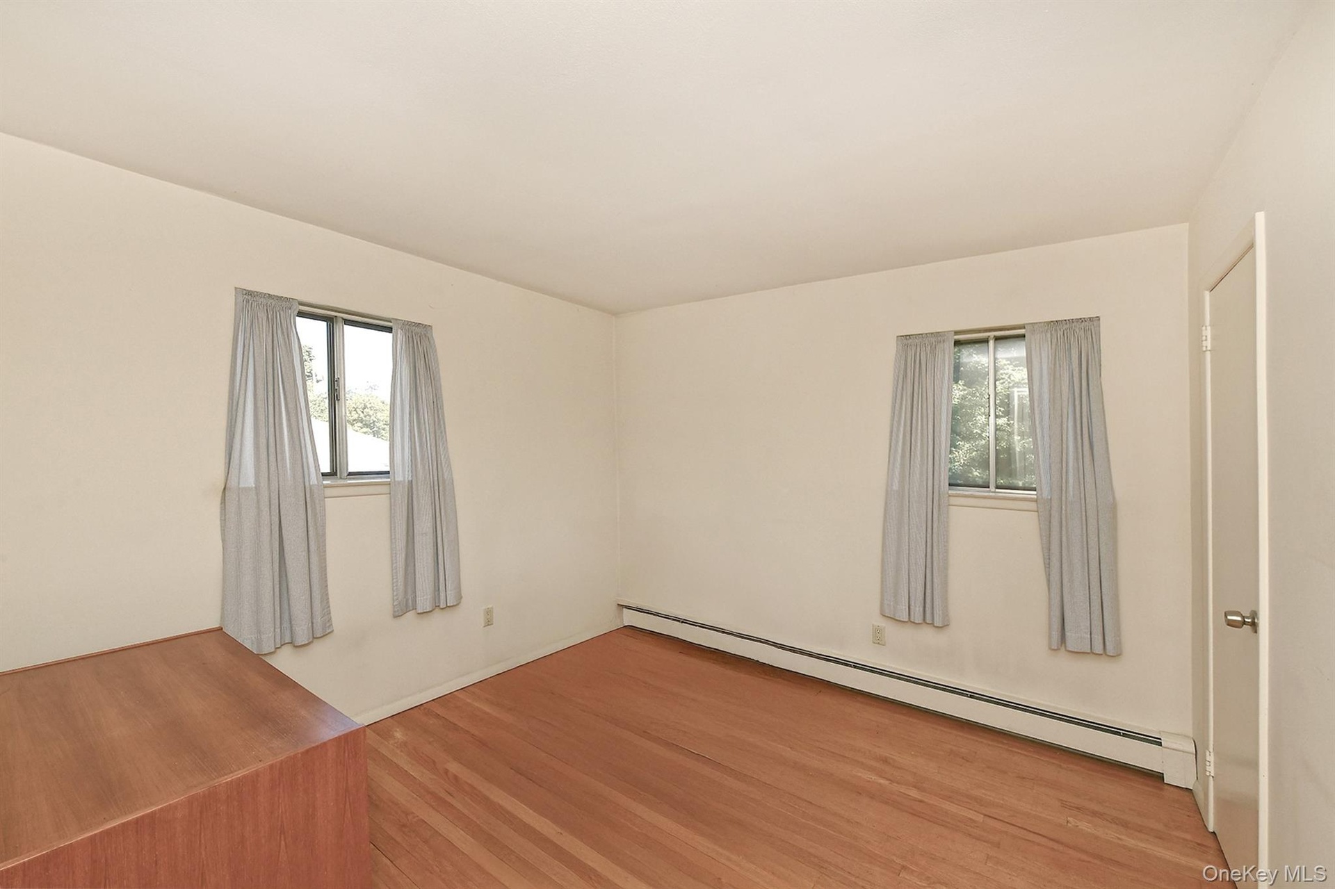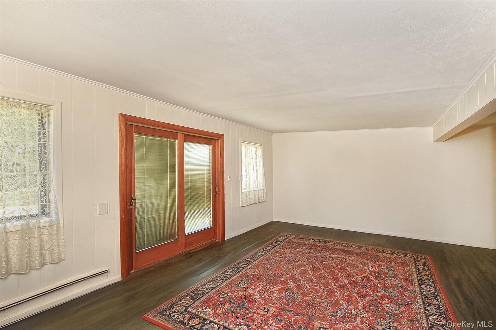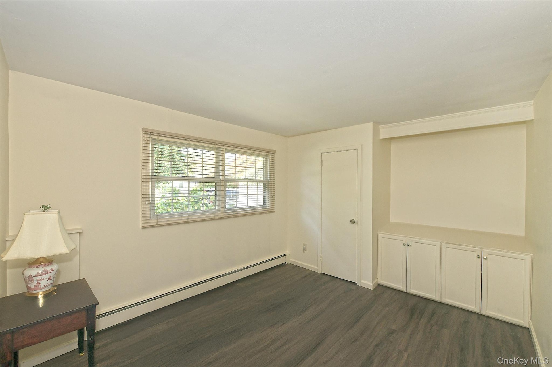 - Spare room featuring a baseboard heating unit and dark wood-style flooring