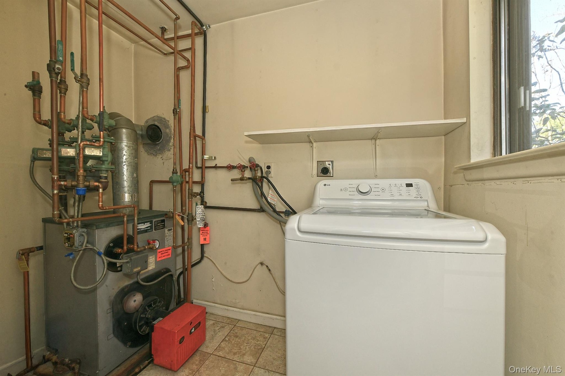 - Washroom with washer / dryer, light tile patterned floors, and a heating unit