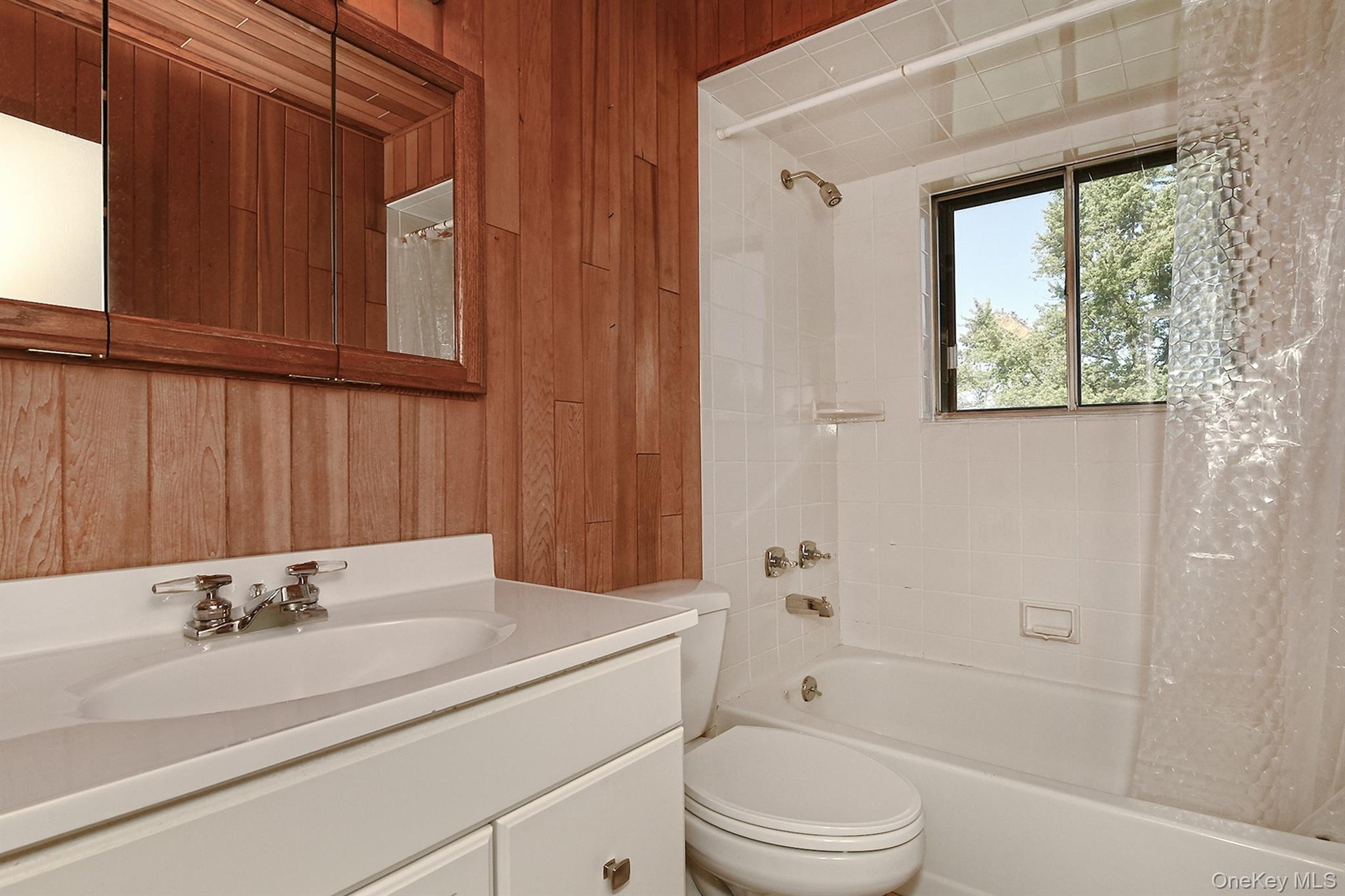 - Full bathroom featuring shower / tub combo with curtain, vanity, and wood walls
