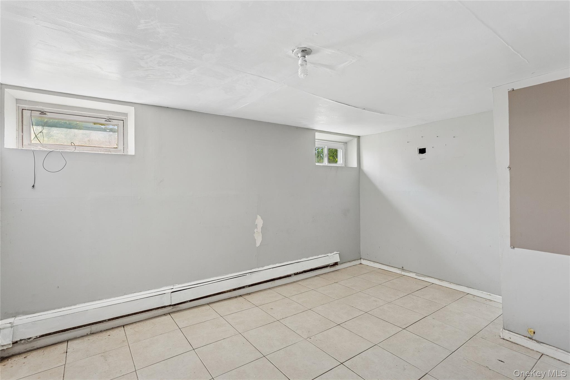 - Below grade area with a baseboard radiator and light tile patterned flooring