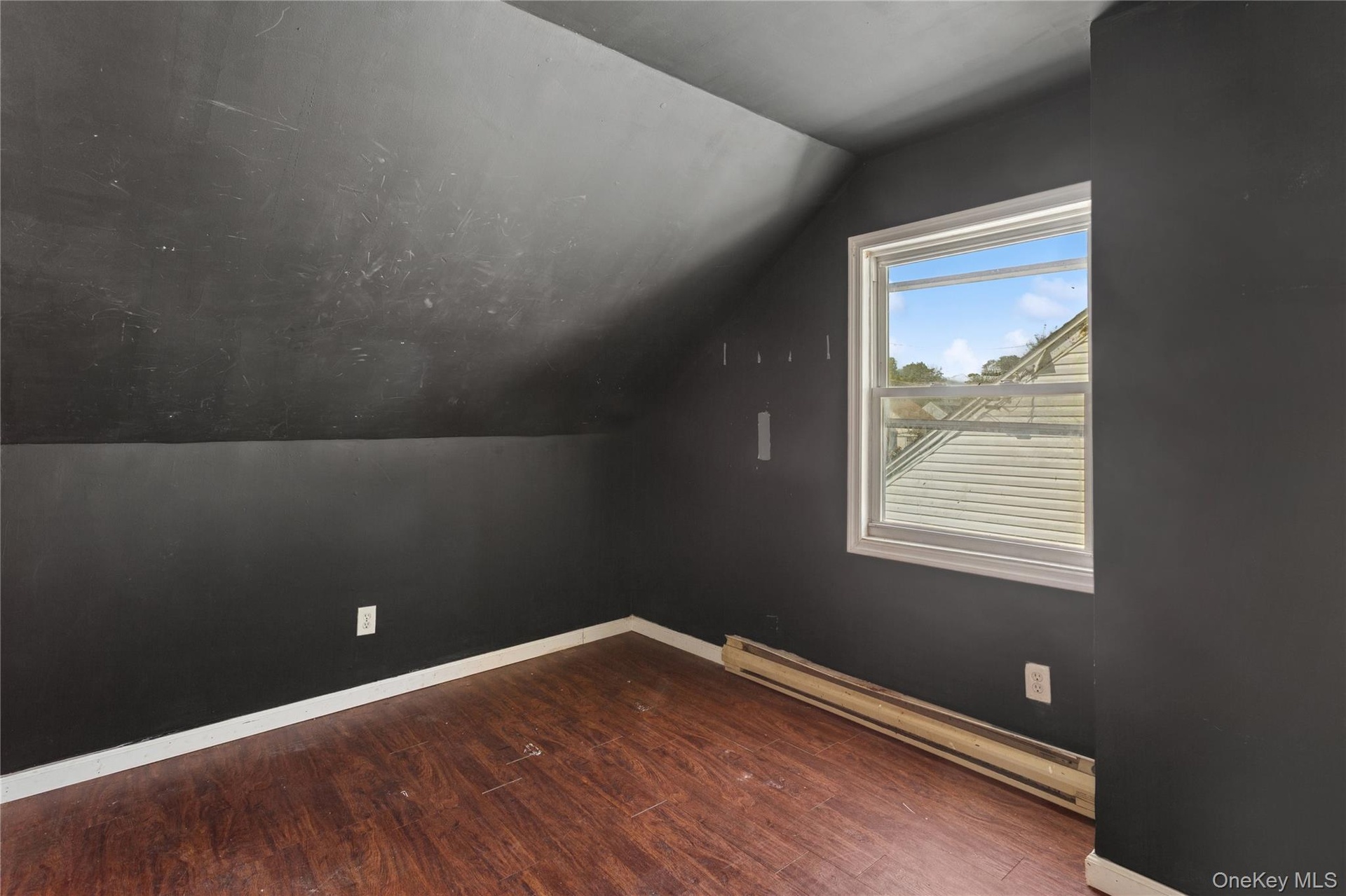 - Additional living space featuring vaulted ceiling, dark wood finished floors, and baseboard heating