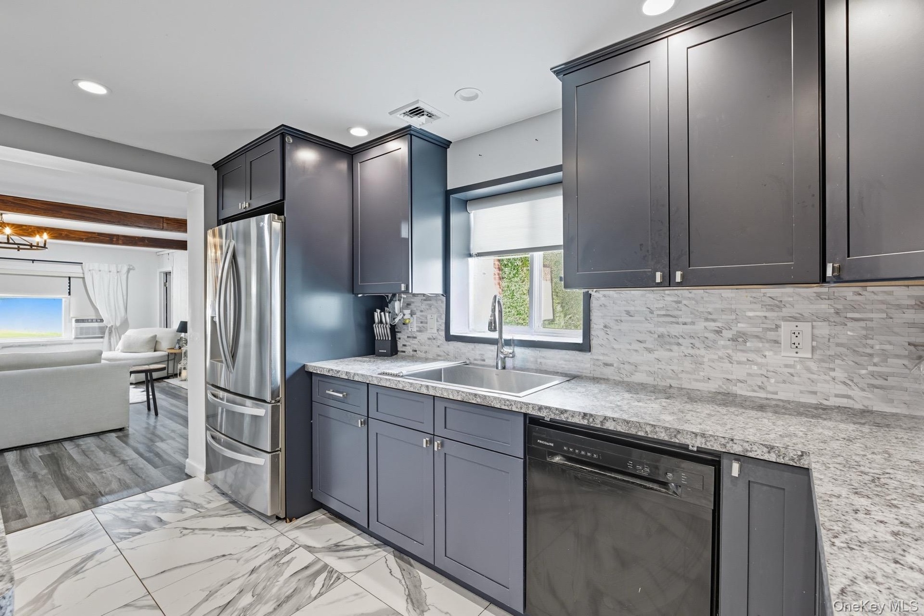 - Kitchen with stainless steel fridge, tasteful backsplash, light marble finish floors, recessed lighting, and black dishwasher