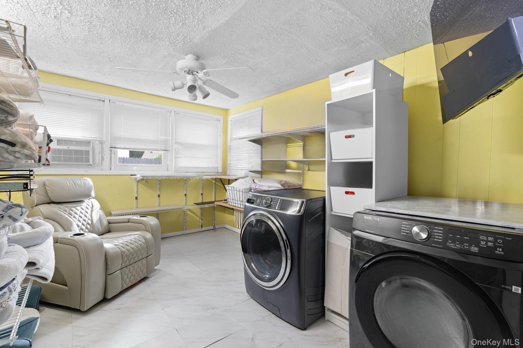 - Laundry area with a ceiling fan, a textured ceiling, light marble finish flooring, washer and clothes dryer, and cooling unit
