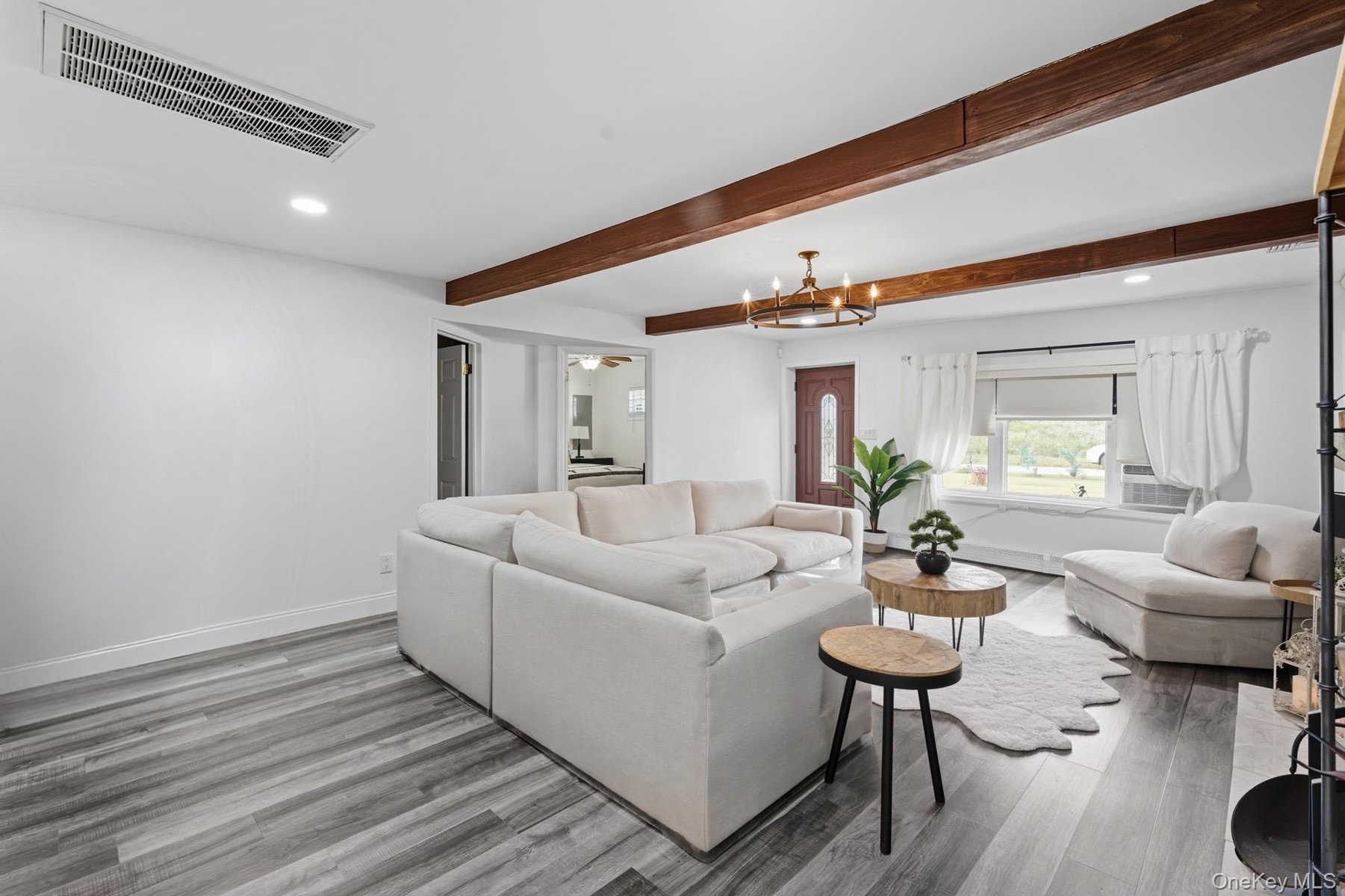 - Living room featuring recessed lighting, wood finished floors, a chandelier, beamed ceiling, and a baseboard radiator