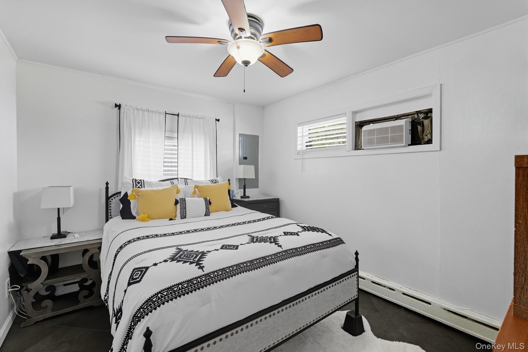 - Bedroom featuring baseboard heating, ceiling fan, and ornamental molding