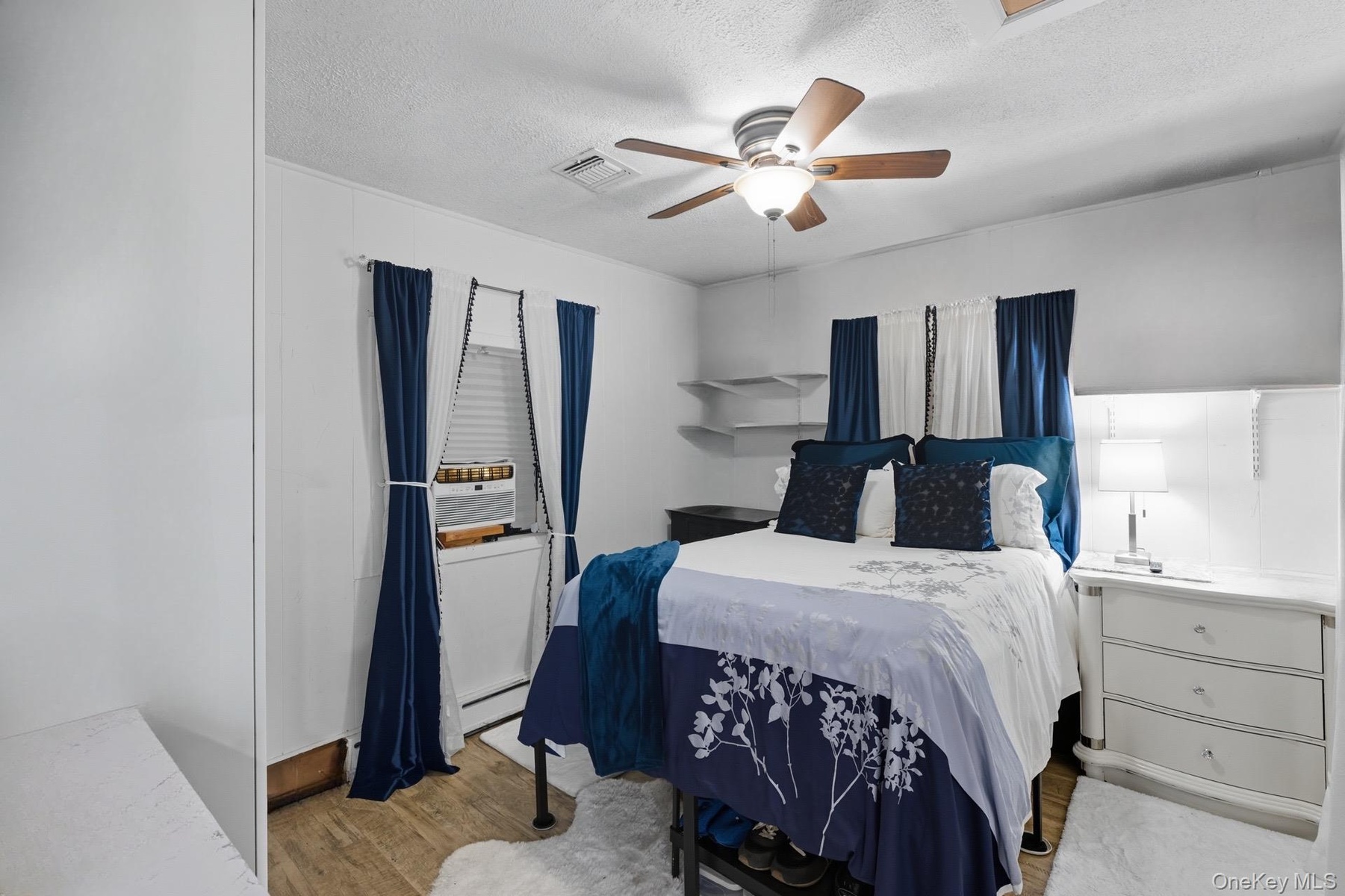 - Bedroom featuring a textured ceiling, wood finished floors, and ceiling fan