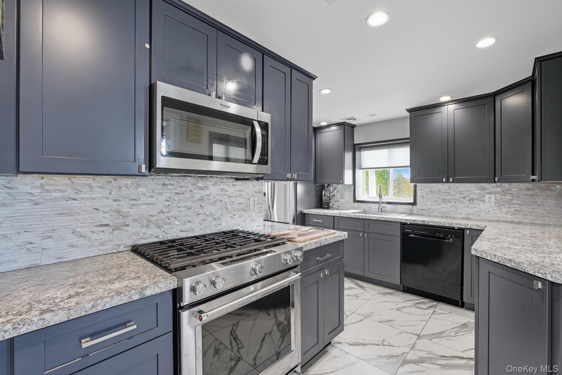 - Kitchen featuring stainless steel appliances, decorative backsplash, light marble finish flooring, and recessed lighting