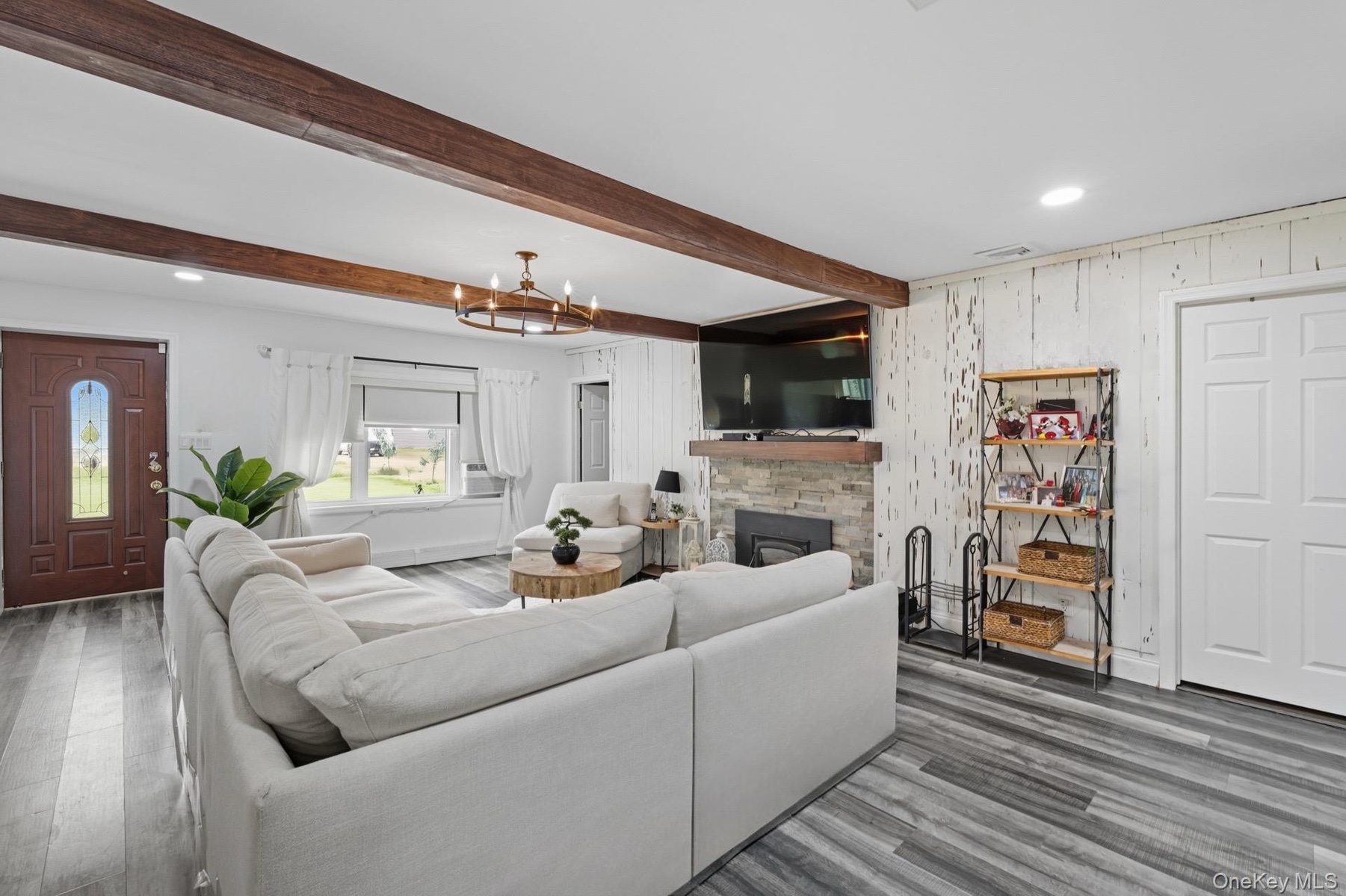 - Living area featuring a stone fireplace, recessed lighting, a chandelier, wood finished floors, and beam ceiling