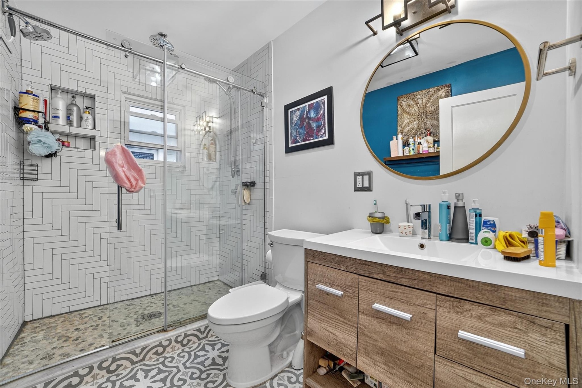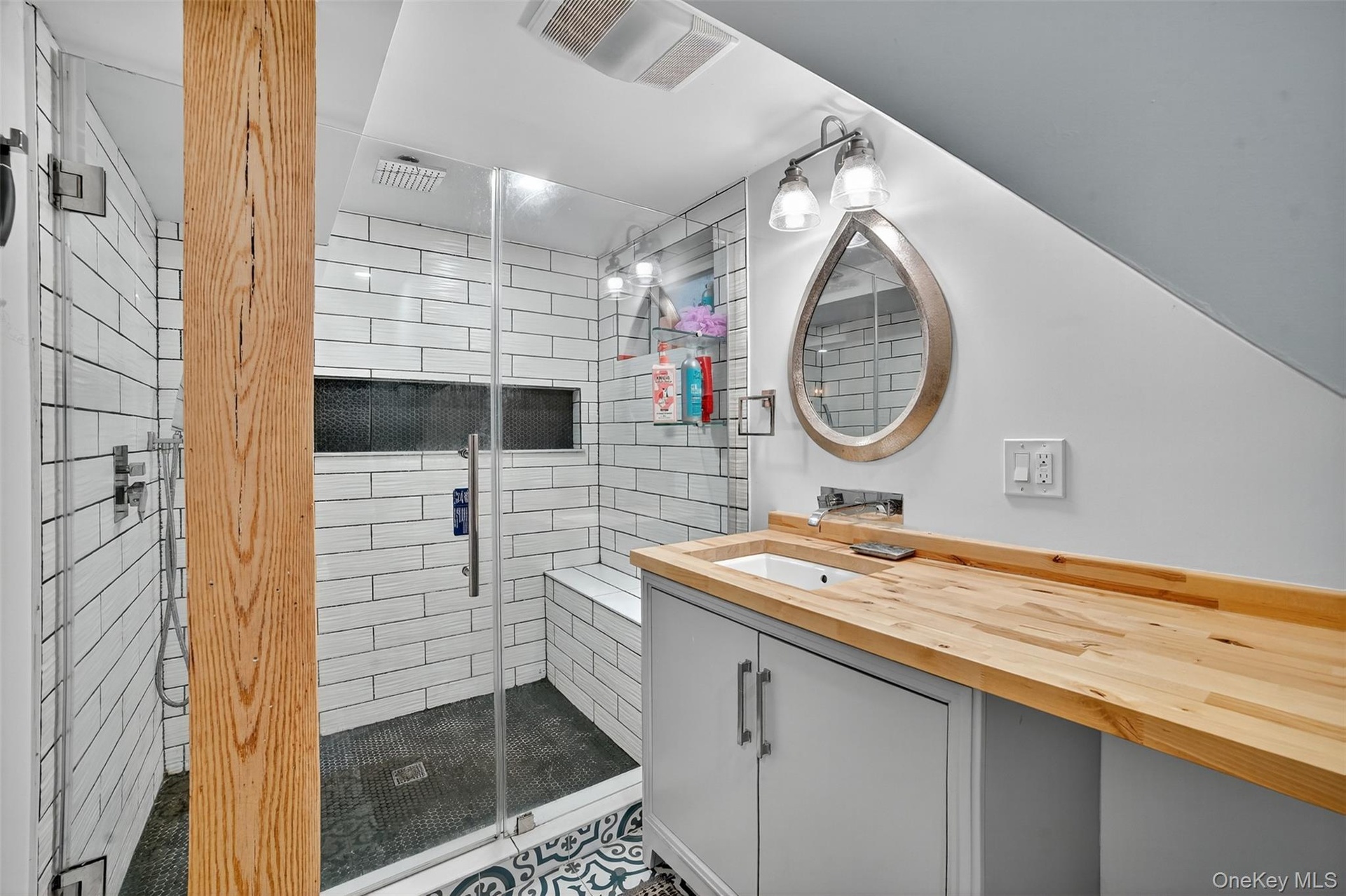 - Bathroom featuring a shower stall, vanity, and tile patterned flooring