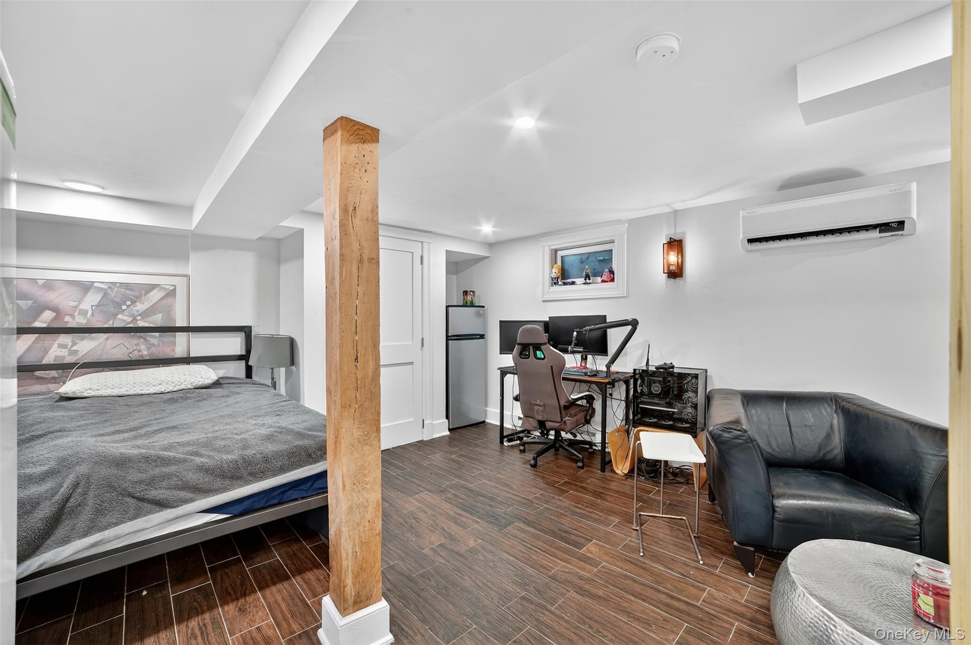 - Bedroom featuring an office area, dark wood-type flooring, freestanding refrigerator, and a wall mounted AC