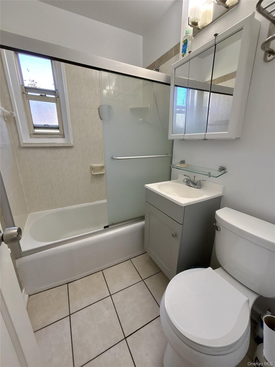 - Bathroom featuring enclosed tub / shower combo, vanity, and light tile patterned floors