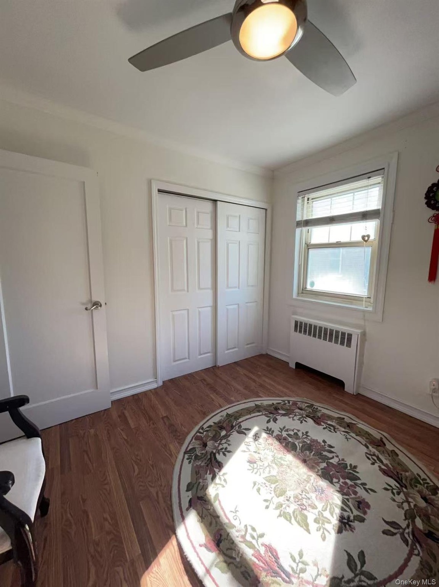 - Bedroom featuring ornamental molding, radiator, wood finished floors, a closet, and ceiling fan